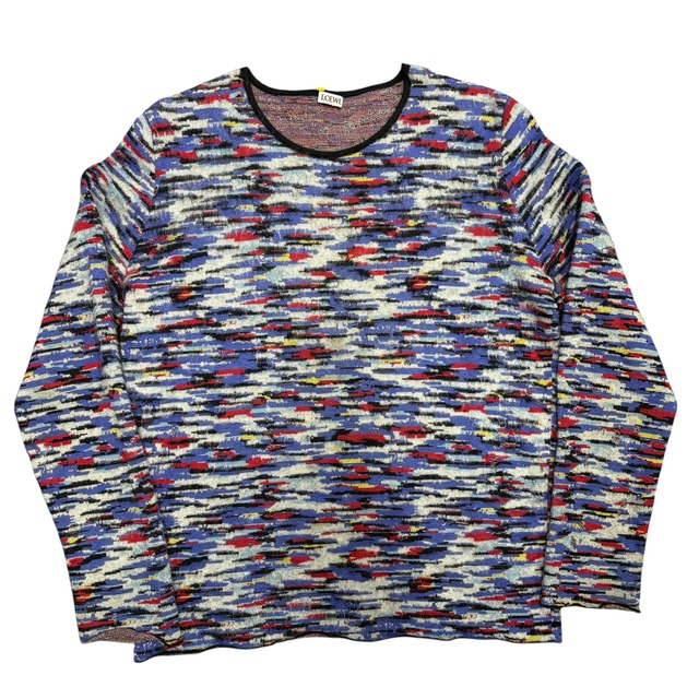 詳細 一目で伝わる、LOEWEらしいテキスタイルの強さ。 ブルーを基調に、レッド・イエロー・ブラックがランダムに走る アートピースのようなミックスパターンニット。 パッと見は抽象画、でも着ると不思議と落ち着く。 この“派手すぎない違和感”の作り方は、さすが老舗メゾン。 素材はヴァージンウール+モヘア混。 毛足がありつつも軽く、落ち感があってシルエットがすごく綺麗。 ところどころ穴あるのでご了承下さい。 タグも片方取れてます。 ・ブランド ロエベ ・カラー マルチカラー ・サイズ M ・年代 2000s〜 ・寸法 着丈約68cm 身幅約54cm 袖丈約50cm[脇からの寸法] 〆素人寸法ですので参考までにお願いします。 *状態は写真をご覧下さい。