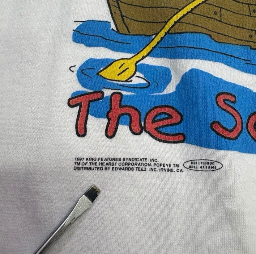 アメリカン・ポップカルチャーのアイコン「ポパイ」がフルカラーでプリントされた一着。1997年コピーライト入りのライセンス品で、ポパイと仲間たちがボートに乗るユルいタッチのグラフィックがなんとも可愛らしい。往年のアニメ好きはもちろん、レトロなアメリカンキャラクターをファッションに落とし込むのにぴったりな一枚。