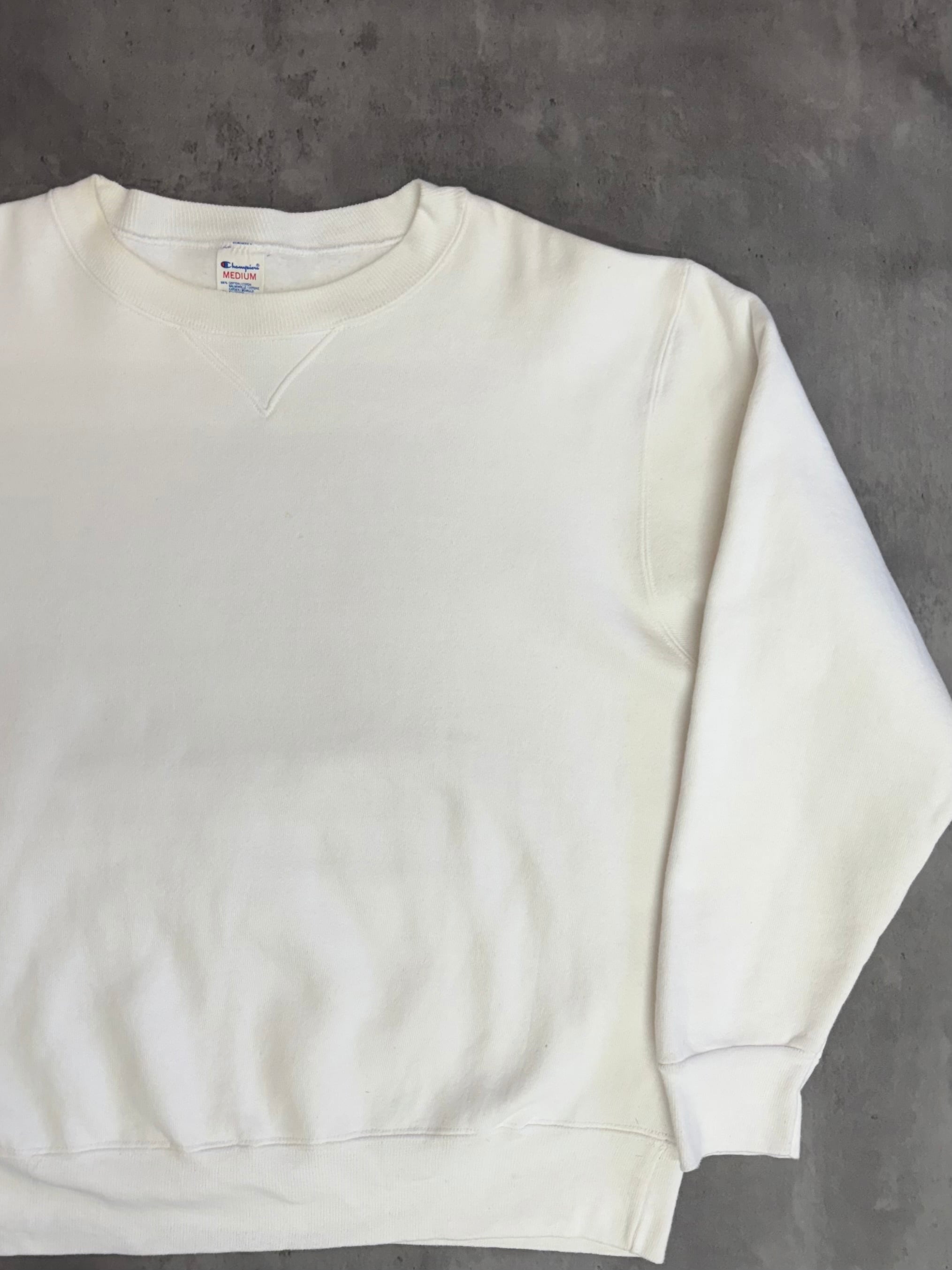 チャンピオンらしい肉厚な生地感とシンプルな佇まいが魅力の一枚。前V仕様のディテールに、完全な目無し(無地)ボディという希少性の高い組み合わせ。コーディネートを問わず着まわせる万能アイテムで、古着好きはもちろんミニマル志向の方にもおすすめです。USA製の88/12ボディ特有の柔らかさと耐久性も健在。