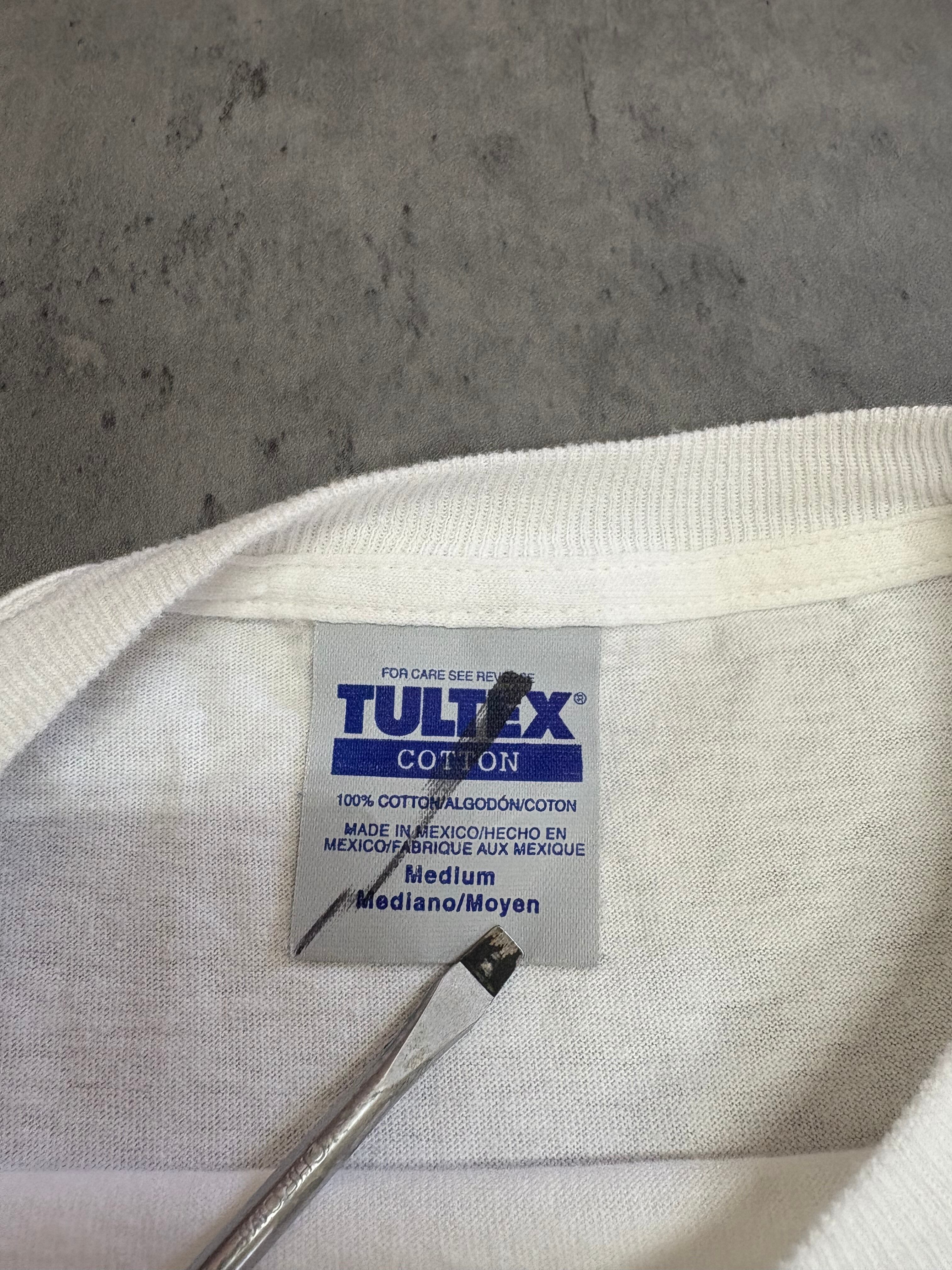 ボディはTULTEX製。メキシコ製の100%コットンで、肌触り柔らかめの一枚。近年、信仰・宗教系プリントTは注目されており、ストリートやY2Kスタイルとの相性も抜群。