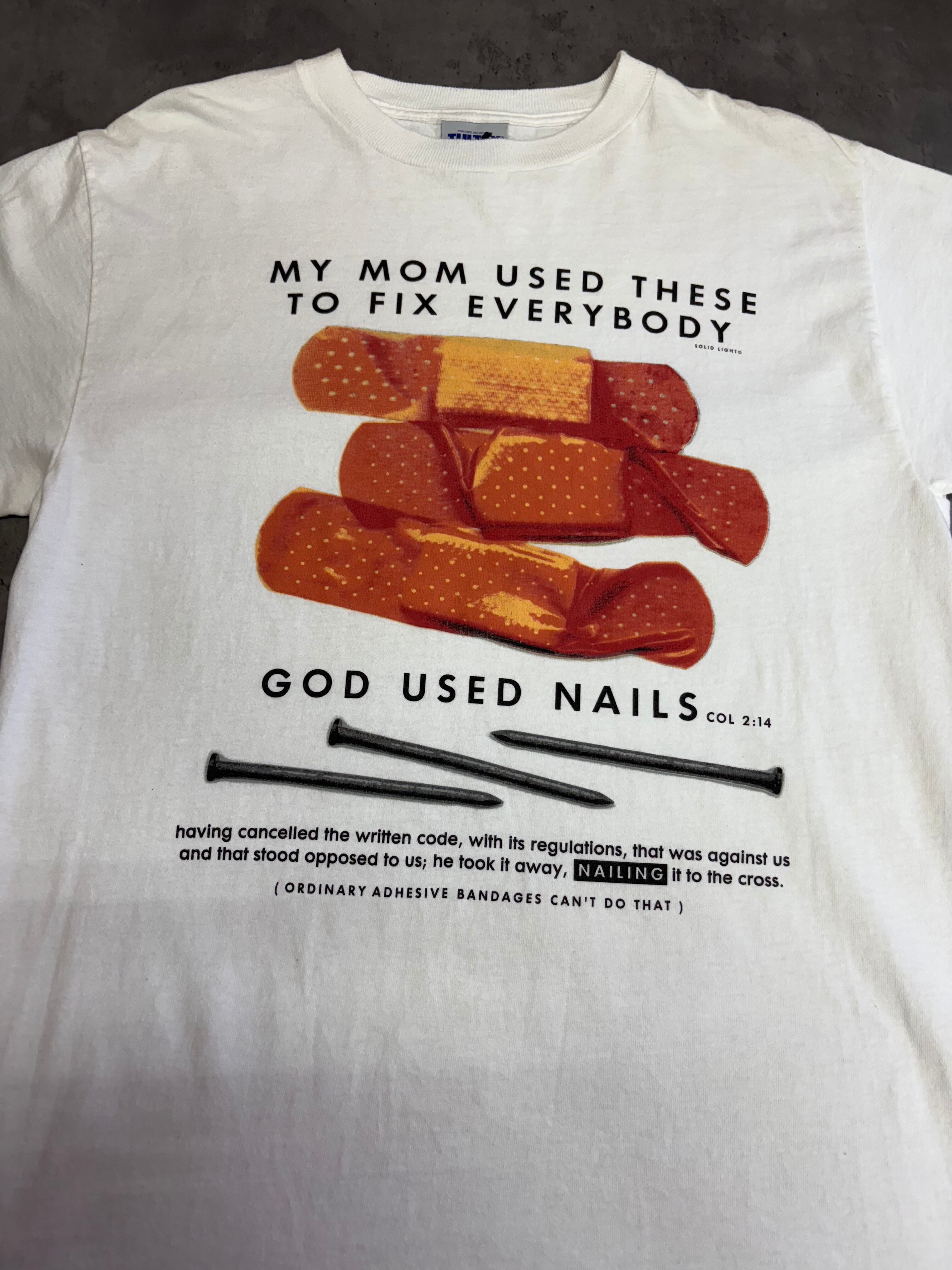 ヴィンテージ・キリスト系グラフィックTの中でも、ユニークな切り口が光る一枚。フロントには「絆創膏」と「釘」を対比させ、「母はこれで皆を治した。神は釘で直した(Col 2:14)」というメッセージを大胆にプリント。ジョークのようなビジュアルに聖書の一節を絡めた、アイロニカルかつ印象的なデザインが魅力です。