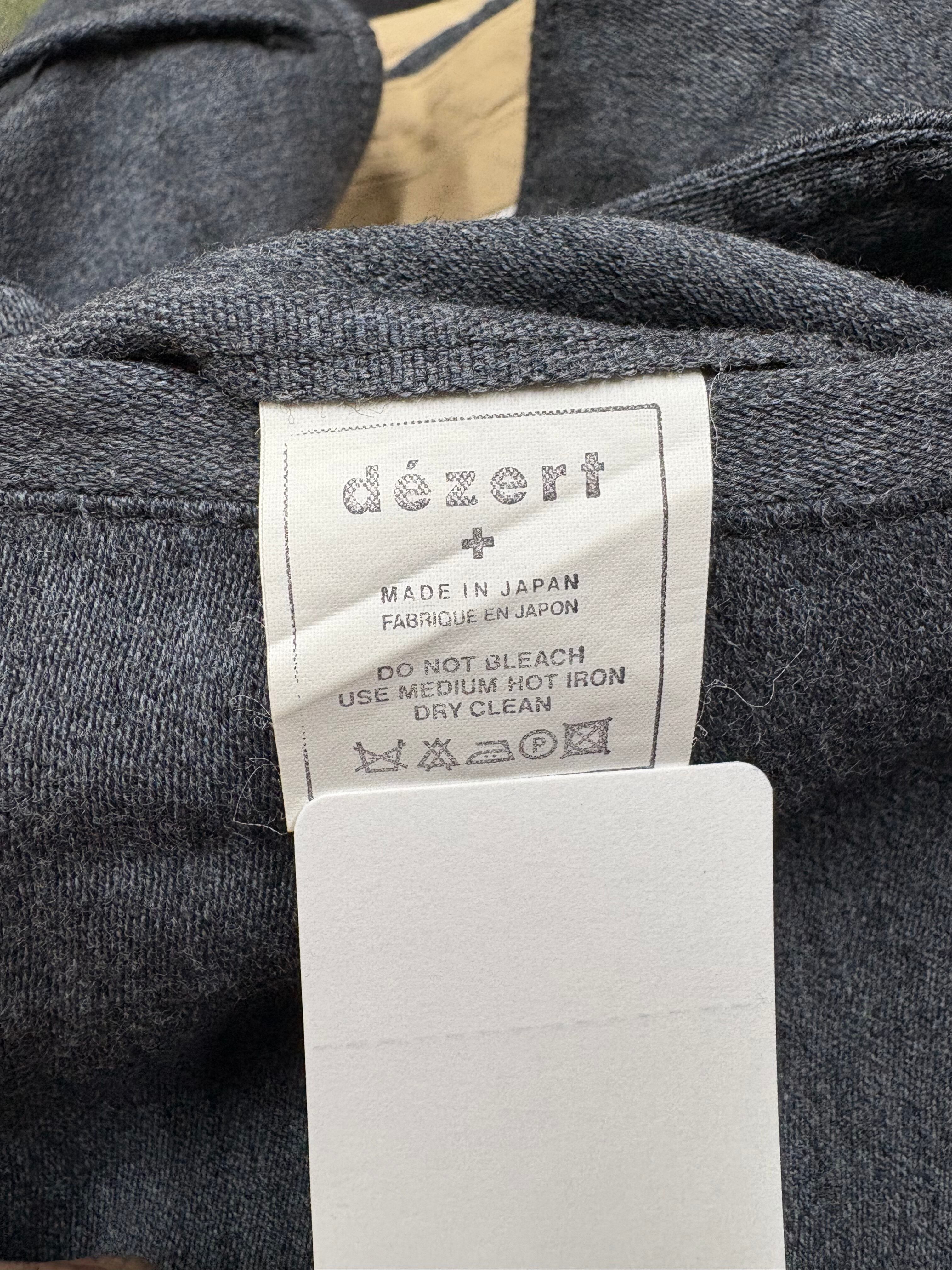 上品なミディアムグレーに、深めの股上&ゆとりのある2タック。腰裏は生成りコットン、裾はダブル仕上げで、クラシックな日本製テーラリングを感じる一本です。タグは“dézert+”のエンジ色織ネーム。フランス語表記のケアタグ(JAVEL INTERDIT=漂白不可、NETTOYAGE À SEC=ドライ推奨)も雰囲気抜群。上品に革靴はもちろん、スニーカー合わせで抜け感あるスタイルにもハマります。