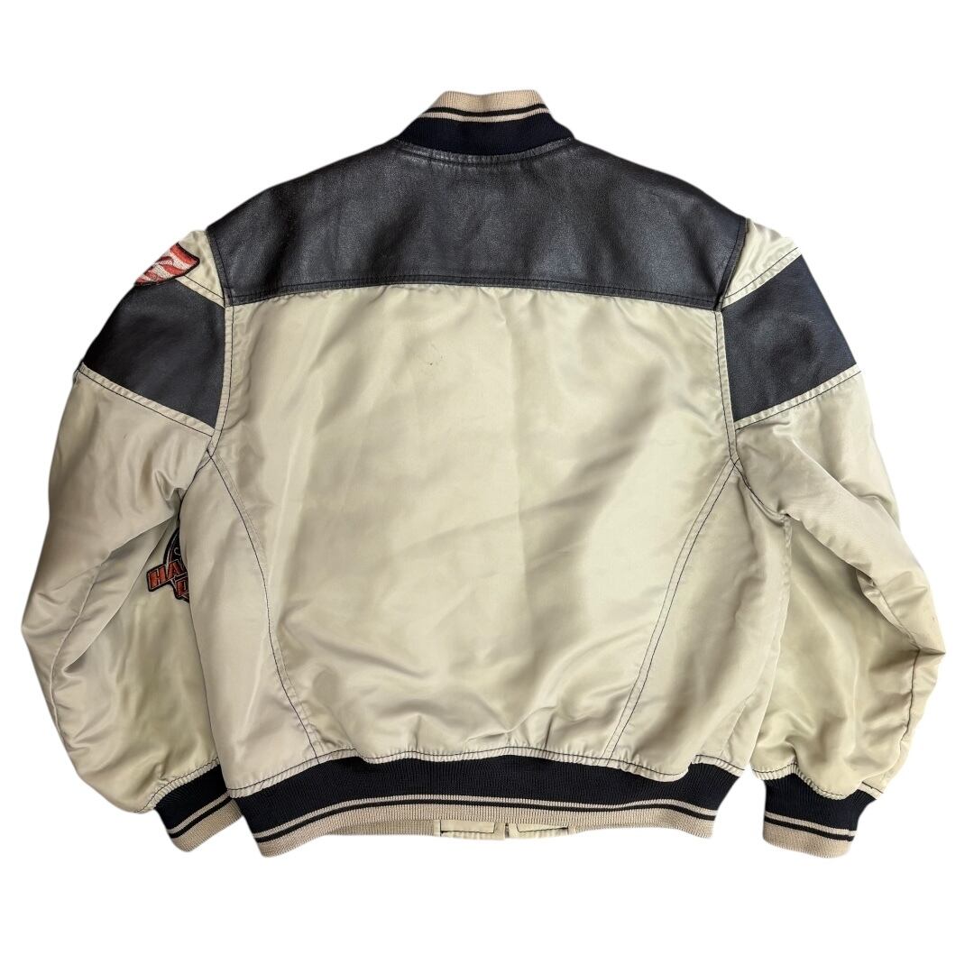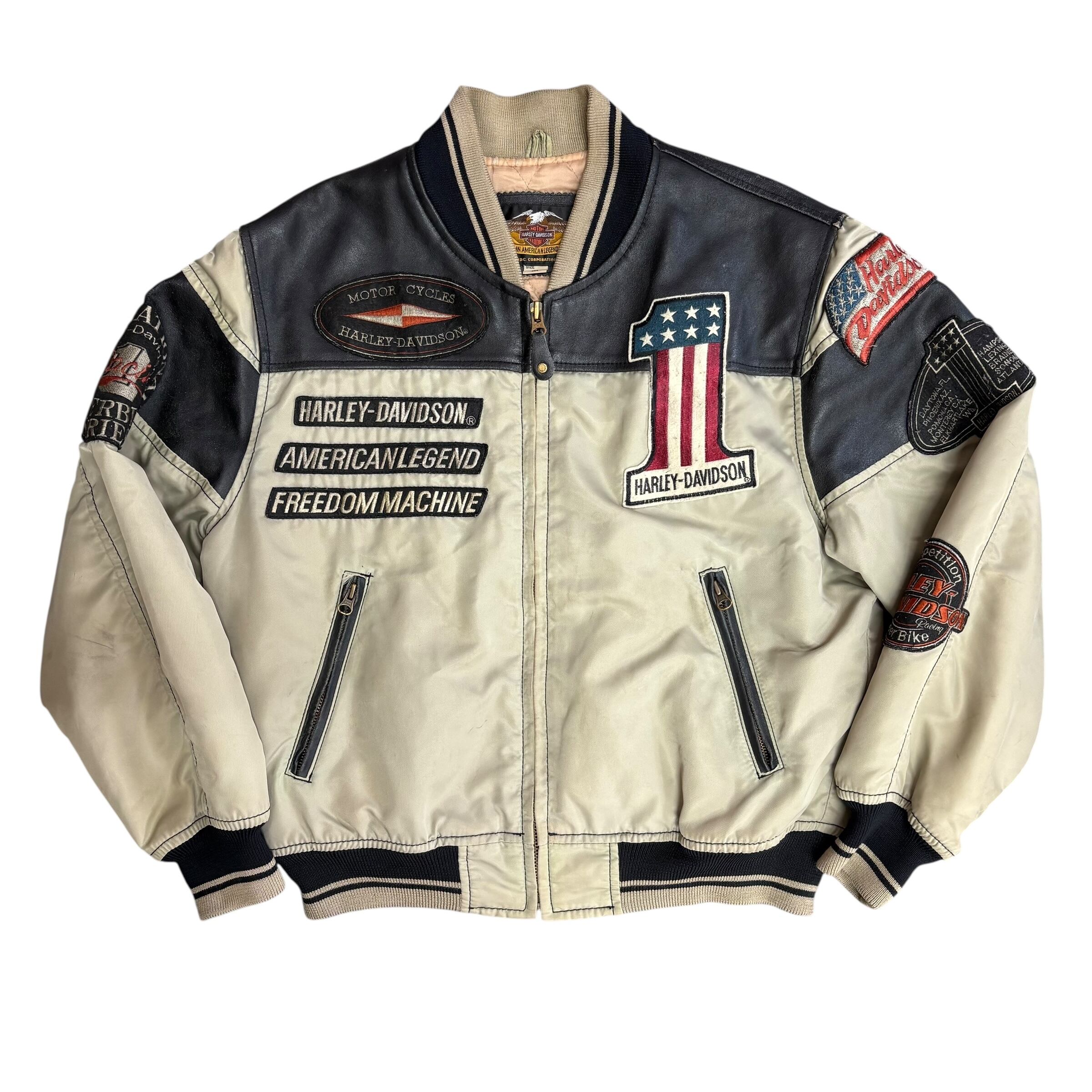 フロントには「No.1 ロゴ」や「AMERICAN LEGEND」「FREEDOM MACHINE」といったパッチが贅沢に施され、両袖にもブランドらしいワッペンを多数配置。ブラックレザーの切り替えと生成りのボディがクラシックで、存在感抜群の一着です。