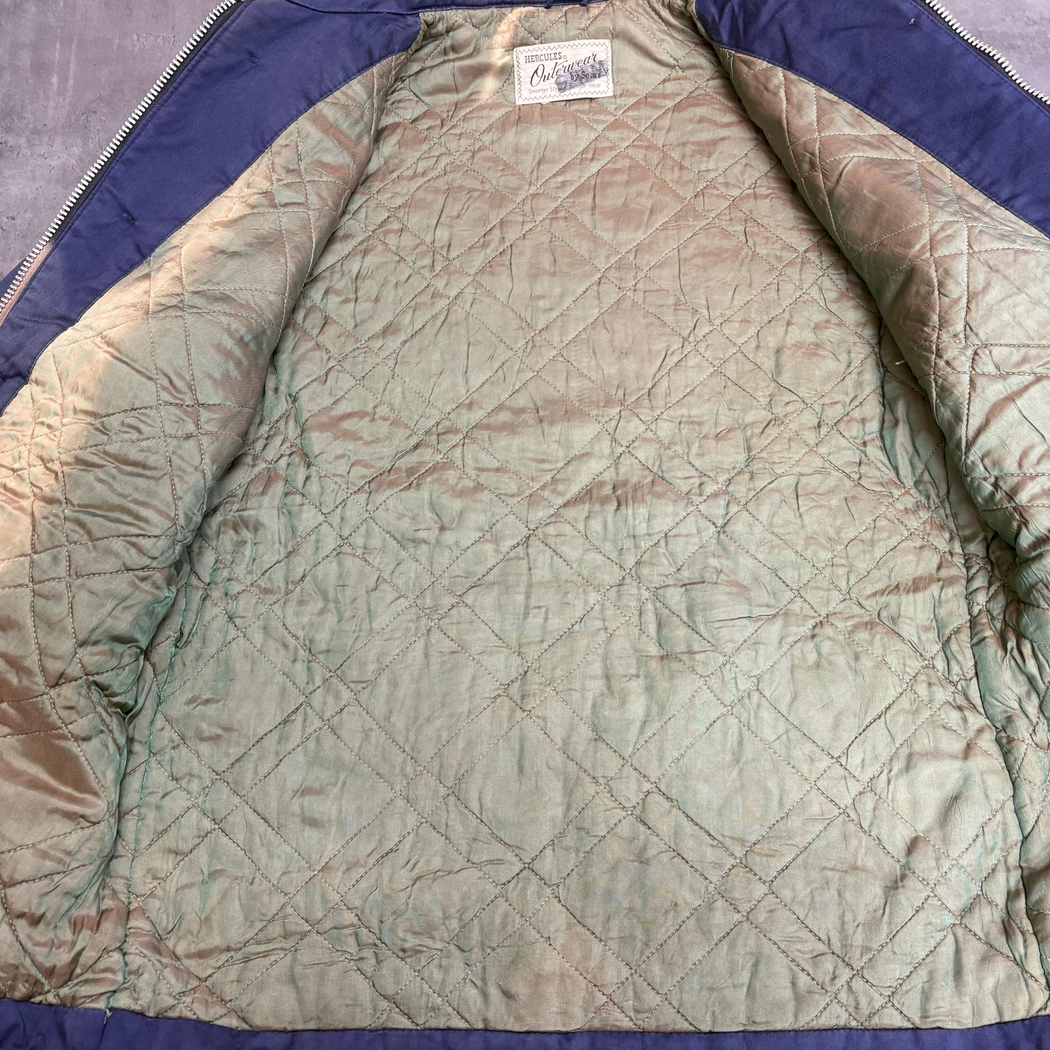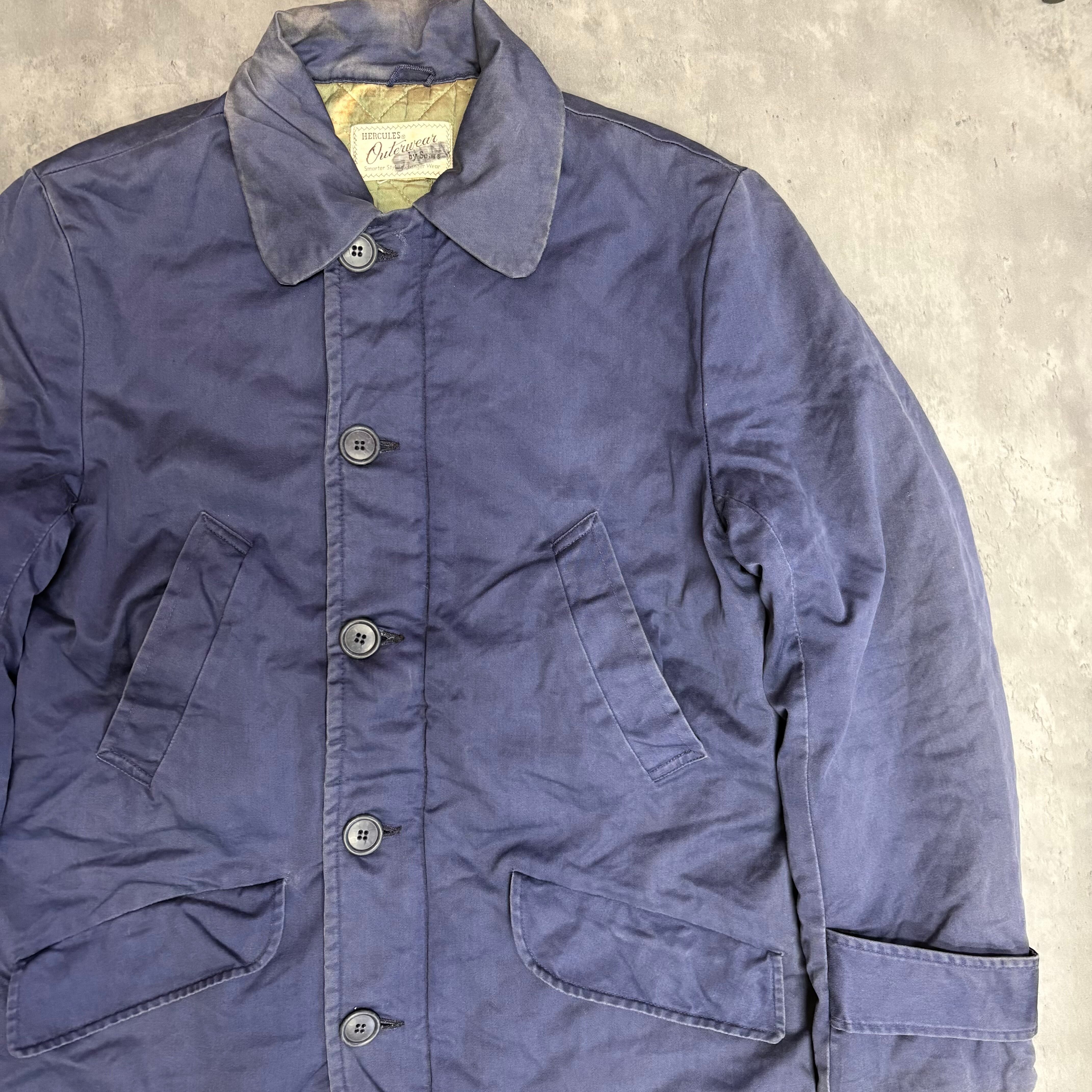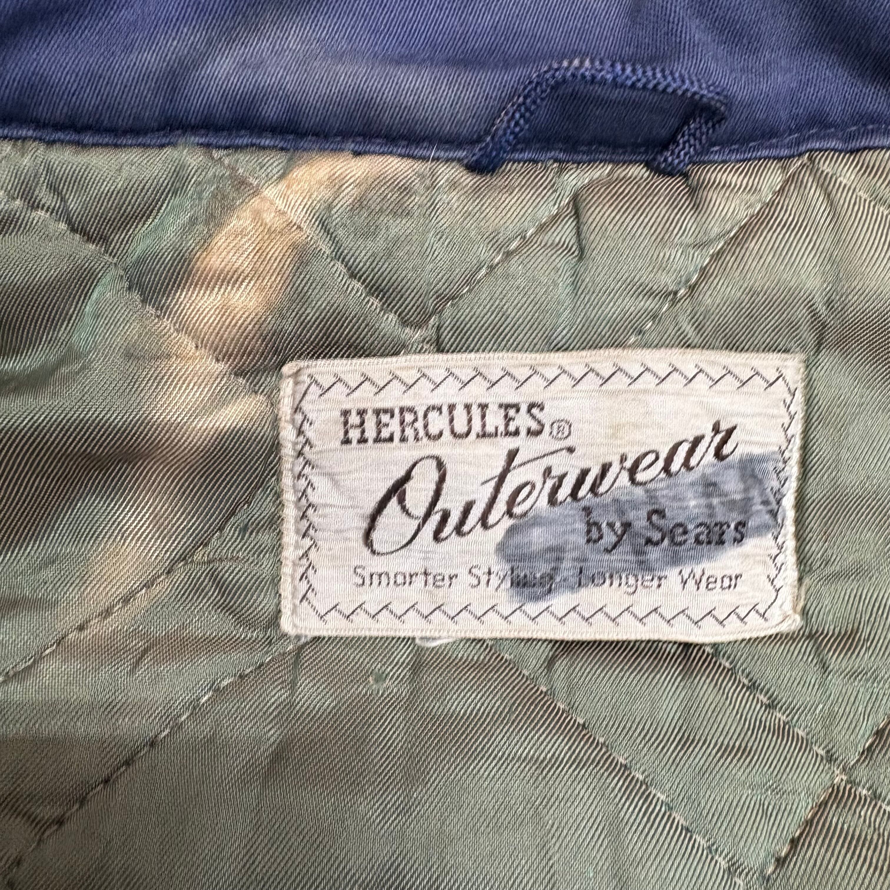 Sears傘下“HERCULES”によるワーク&カジュアル向けのB-9型シルエット。40s USAAFの名作「B-9フライトジャケット」をベースにした民間アウトドア仕様で、ボタン×TALONジップの二重前立て、ダイヤキルトの中綿ライナーを搭載。軍モノ直系の無骨さに、タウンユースの実用性を掛け合わせた一着です。濃紺がフェードした雰囲気は、まさにヴィンテージならでは。