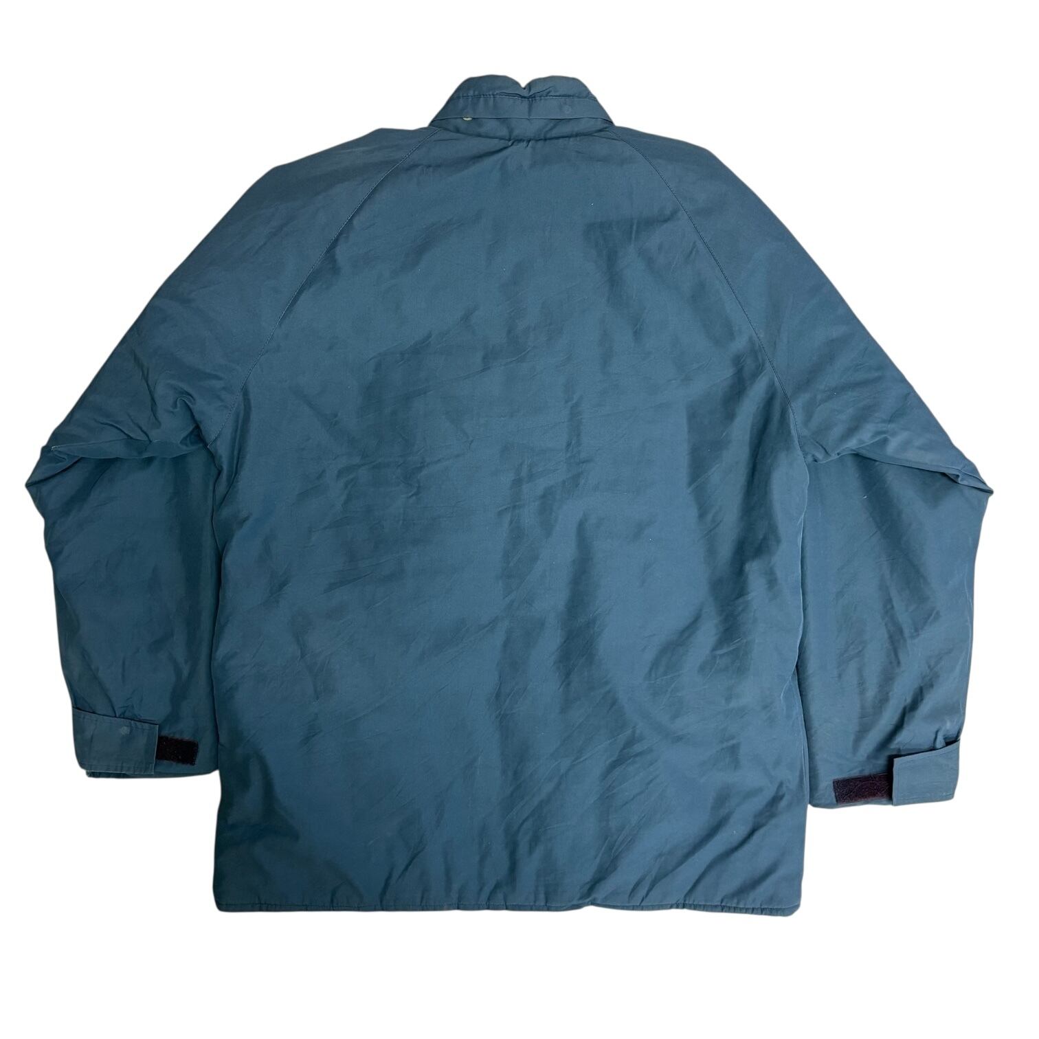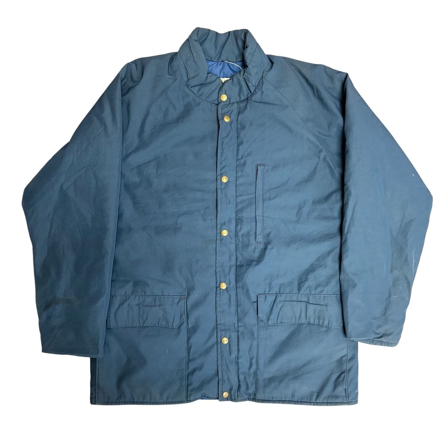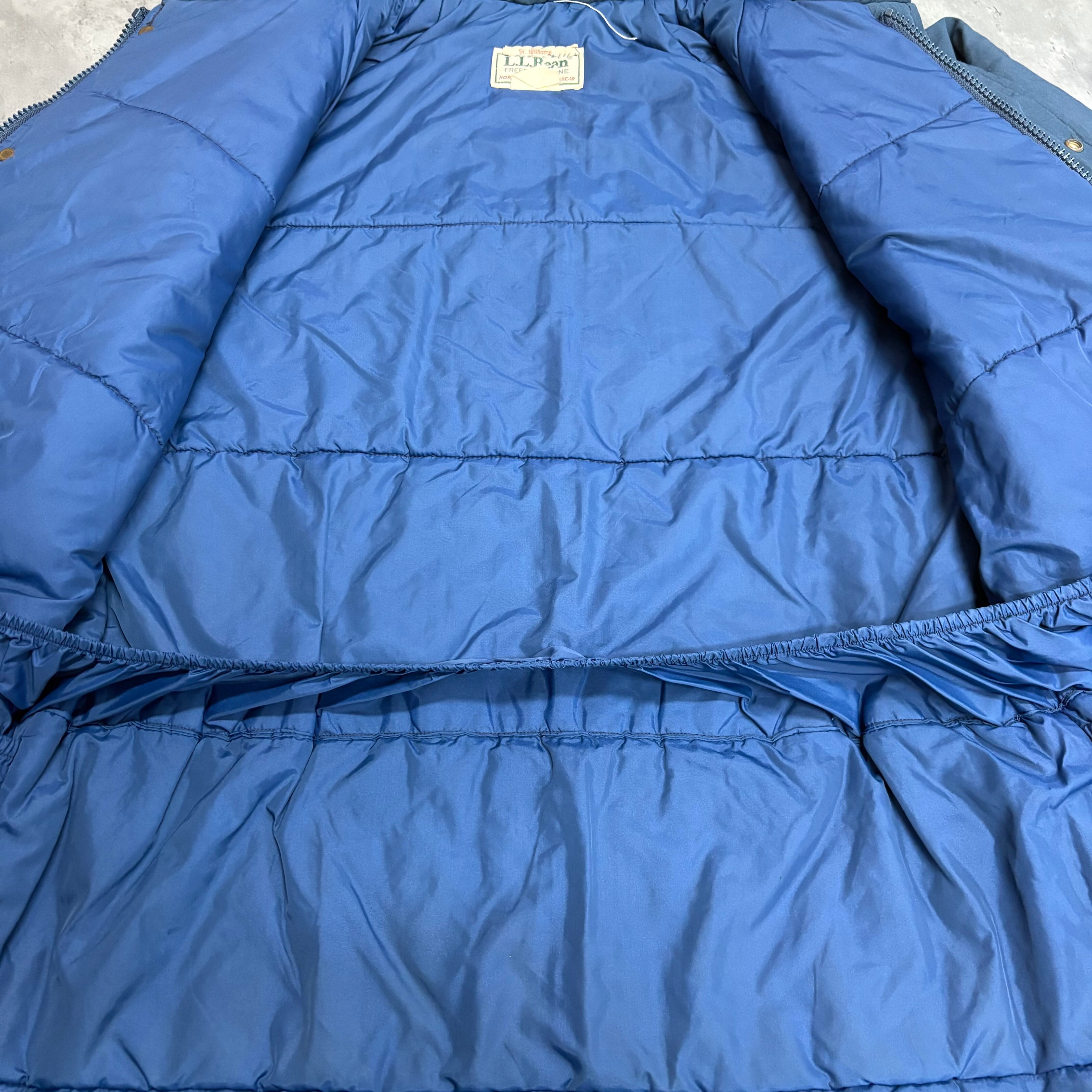 アメリカの老舗アウトドアブランド L.L.Bean から、クラシックなノースウッズ・アウターウェア。やや光沢のあるポリエステル×コットンシェルに、ナイロンライニング&ダクロンポリエステル中綿を搭載した防寒仕様のワーク/アウトドアジャケットです。落ち着いたブルーカラーにゴールドのスナップボタンが映える、シンプルながら雰囲気ある一枚。