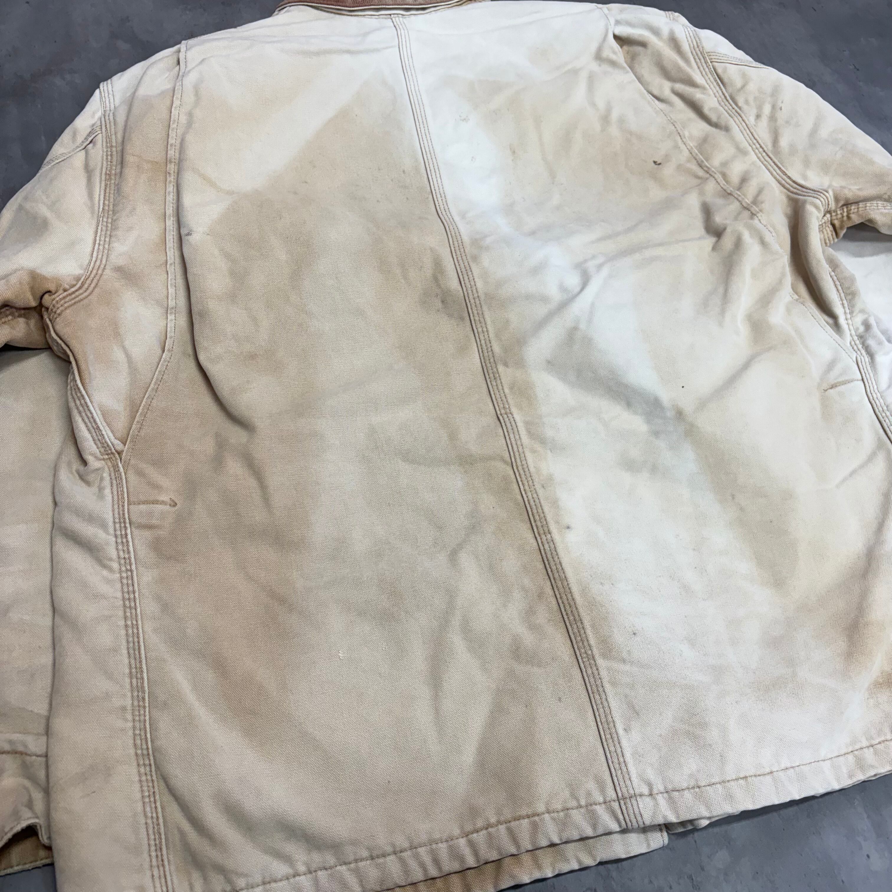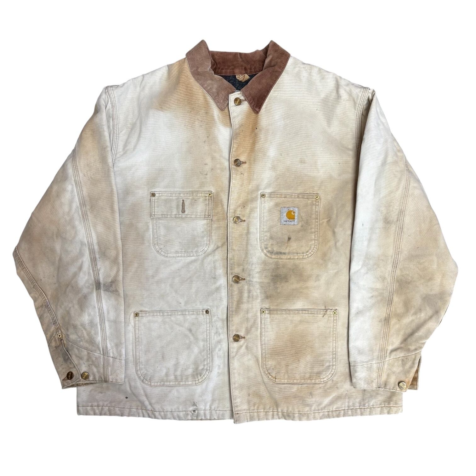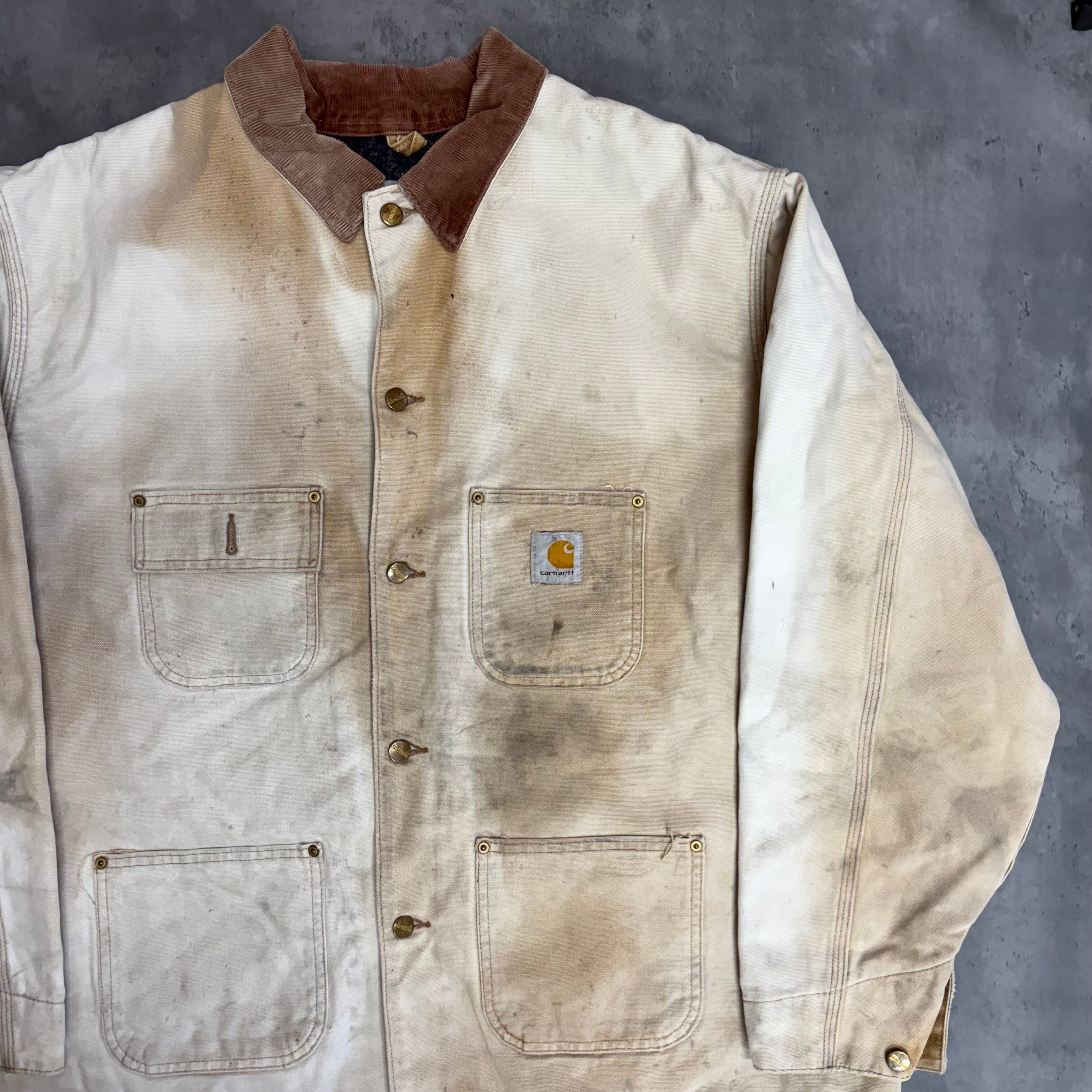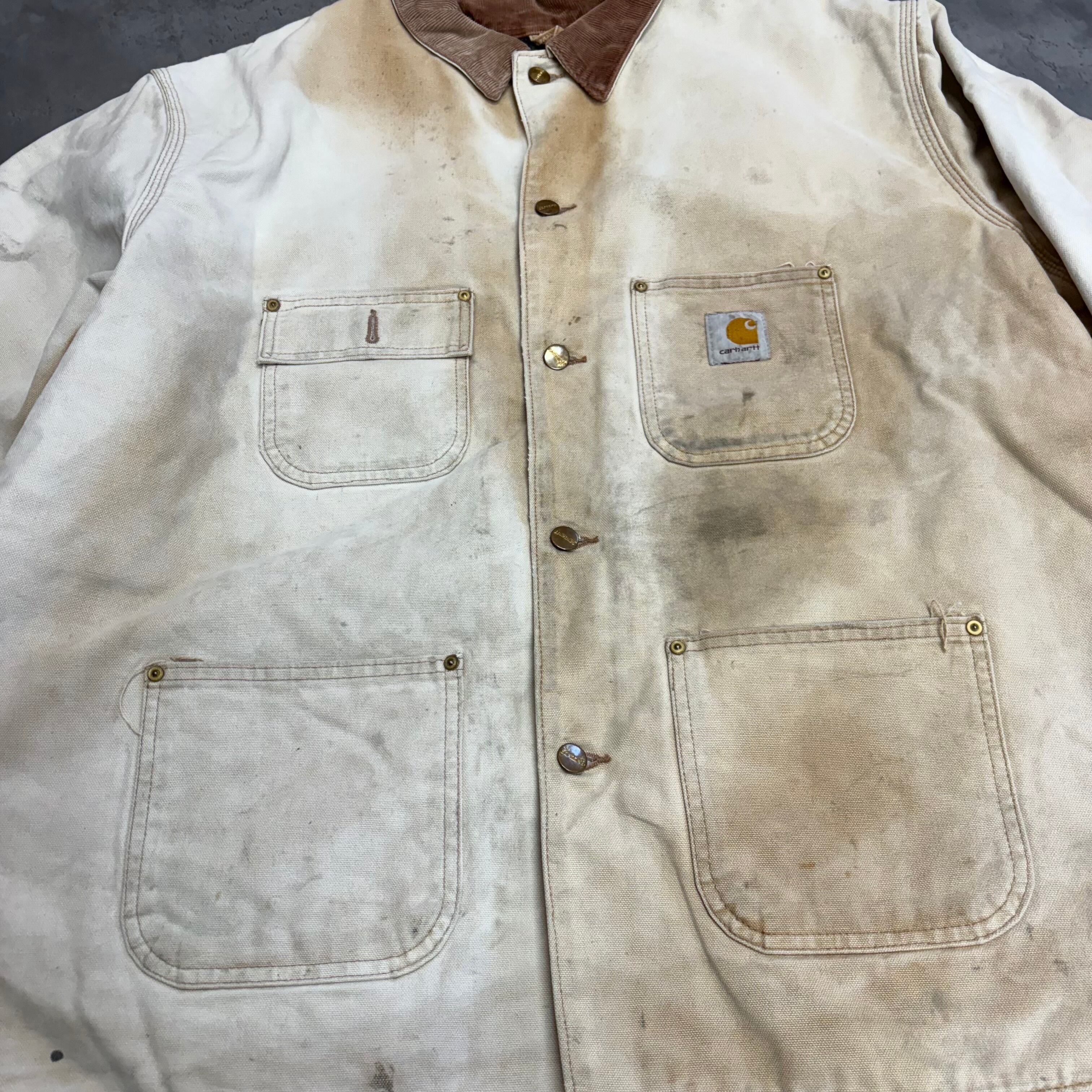 アメリカのワークウェアを代表するCarharttの名作「チョアコート」。定番のブラウンダックやブラックに比べ、希少なナチュラルダック(生成りカラー)。長年の着用で入ったオイルや土汚れ、フェード感が“本物のワーク”を物語る雰囲気系の一枚です。首元はブラウンコーデュロイの切り替えで、クラシックなアメカジスタイルに欠かせない存在。