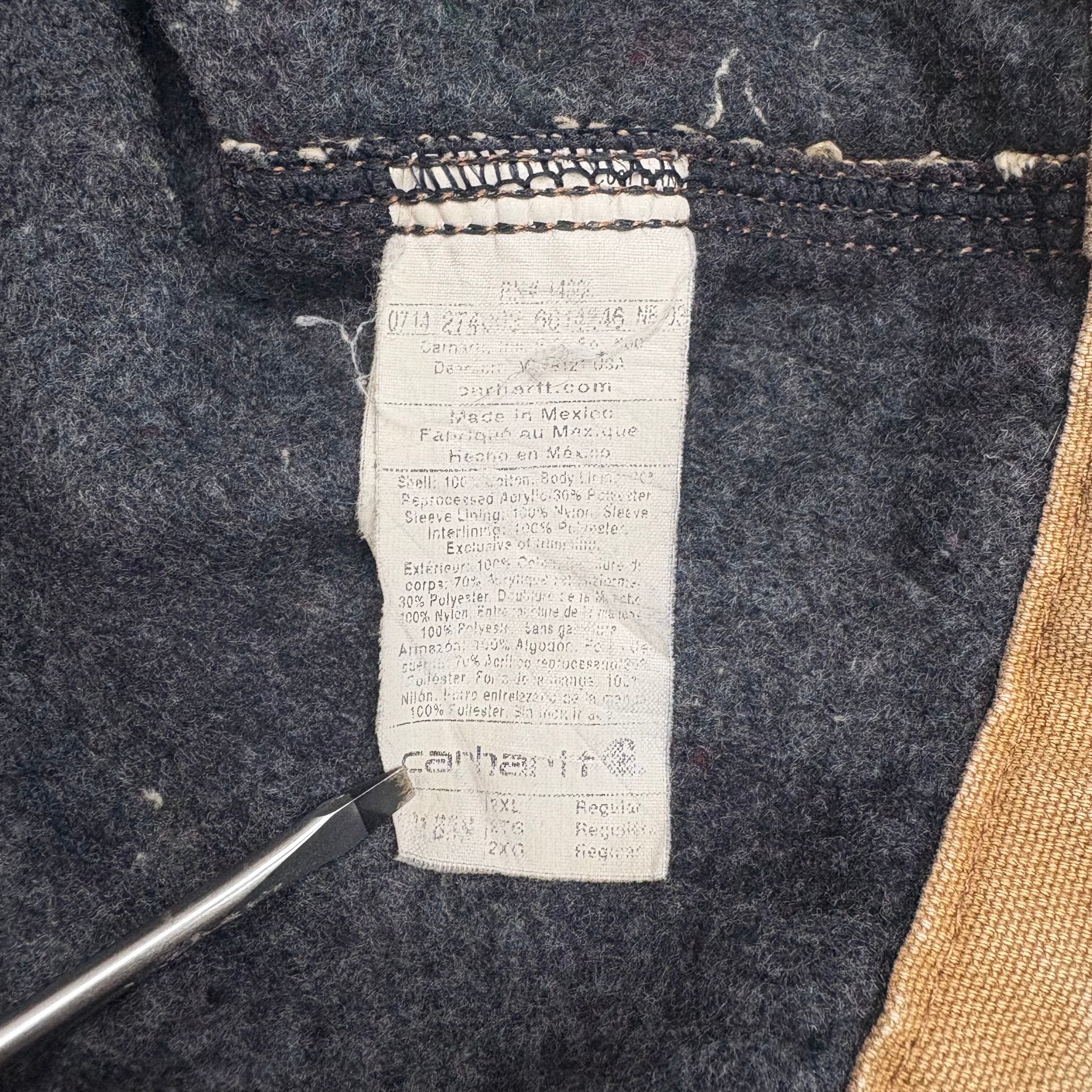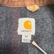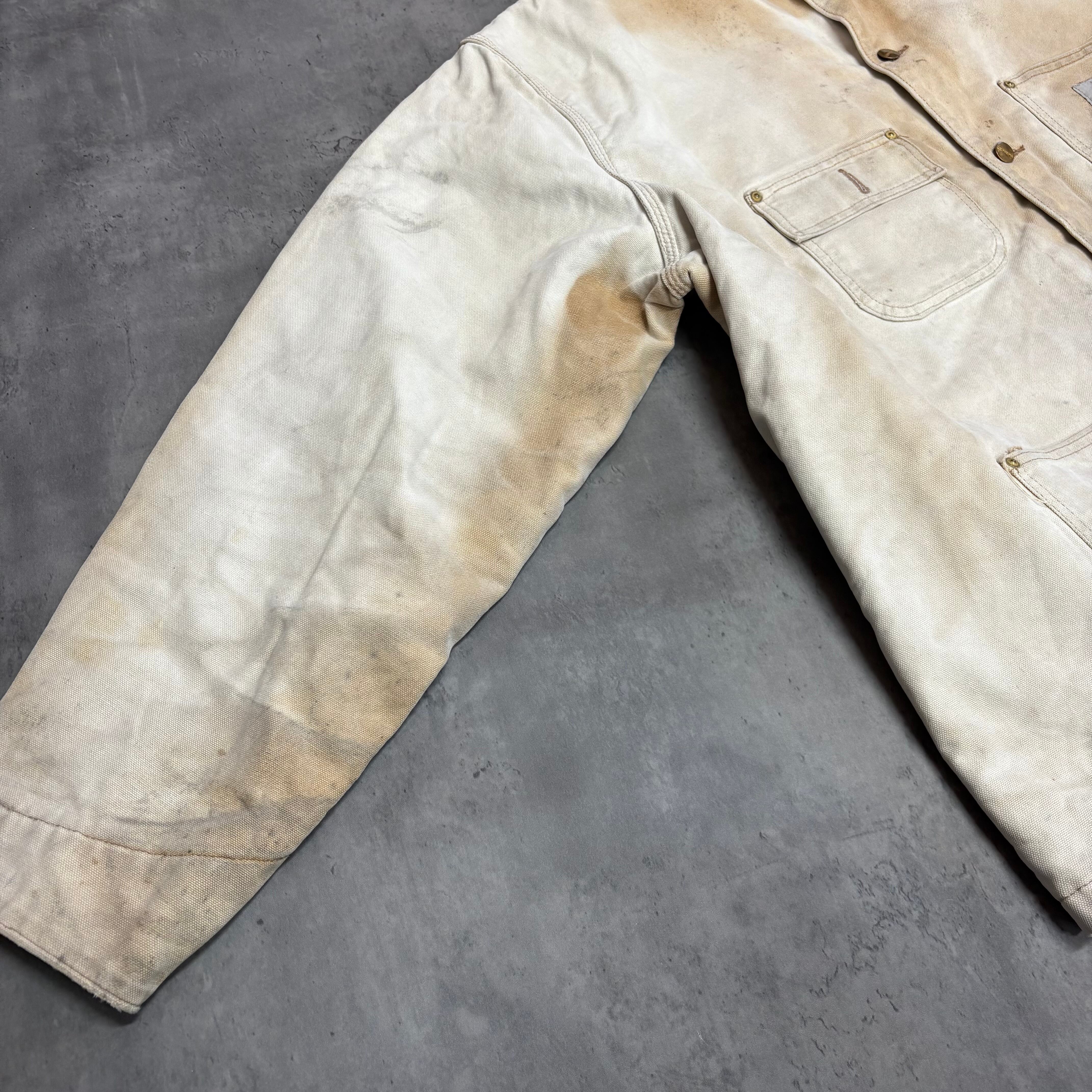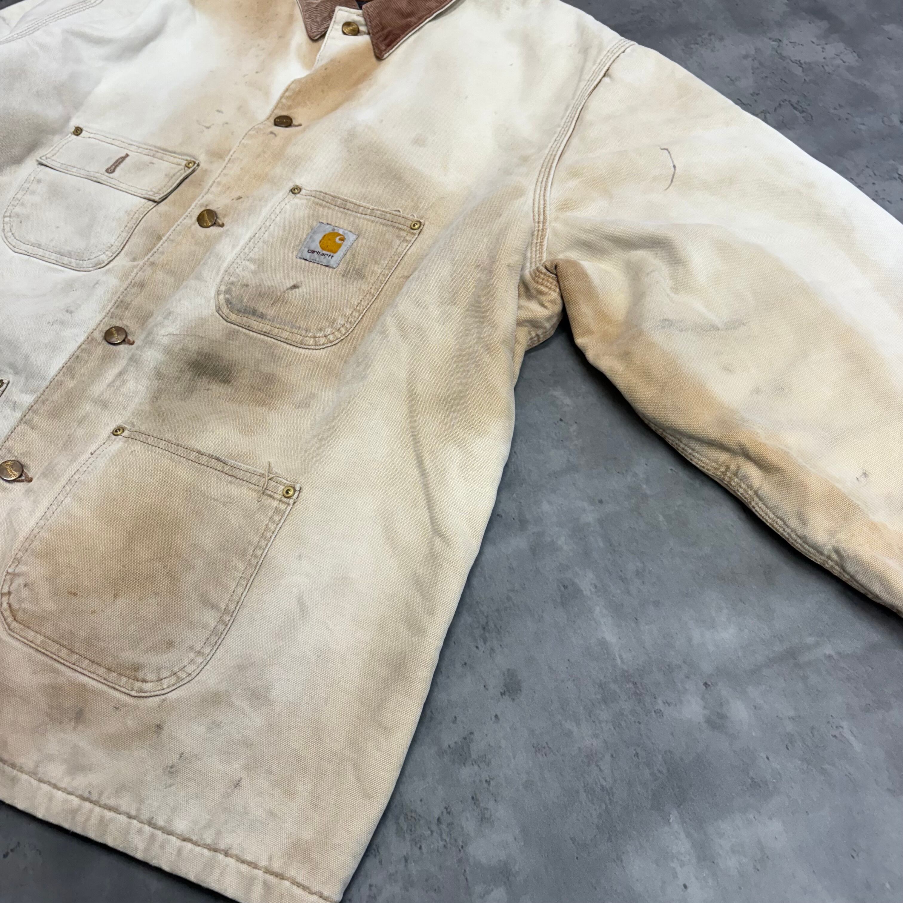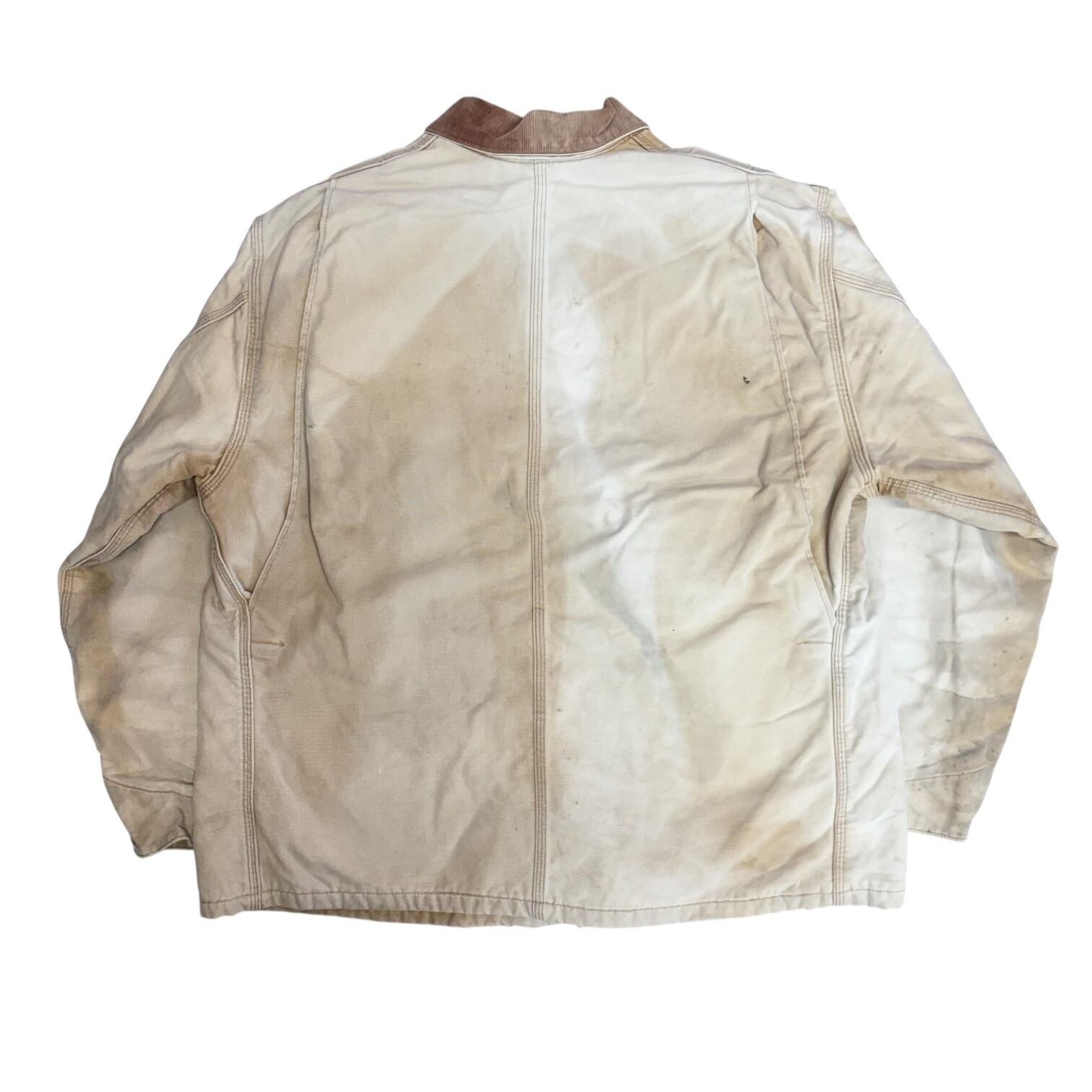 アメリカのワークウェアを代表するCarharttの名作「チョアコート」。定番のブラウンダックやブラックに比べ、希少なナチュラルダック(生成りカラー)。長年の着用で入ったオイルや土汚れ、フェード感が“本物のワーク”を物語る雰囲気系の一枚です。首元はブラウンコーデュロイの切り替えで、クラシックなアメカジスタイルに欠かせない存在。