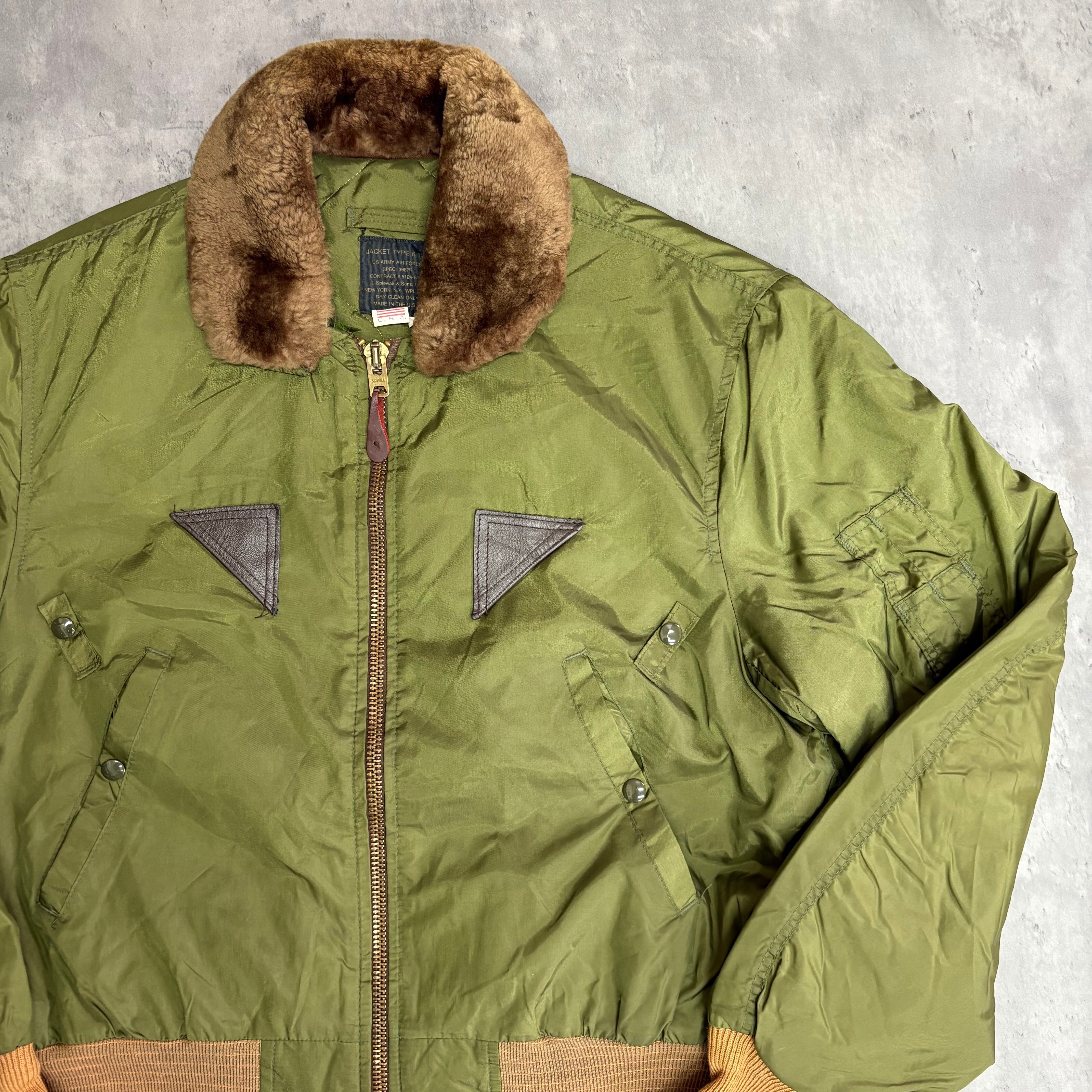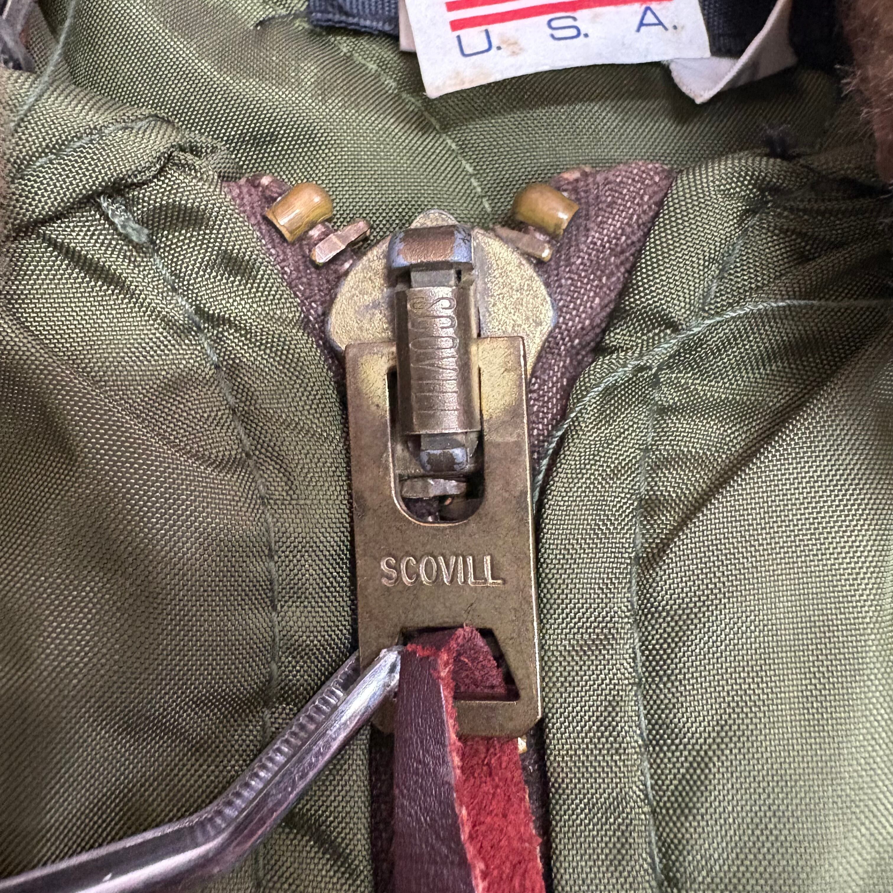 米空軍の名作フライトジャケット「B-15」シリーズの後期型、B-15F。シンセティックファーの襟、オリーブドラブナイロンシェル、ブラウンのレザーパーツなど、MA-1に移行する直前の過渡期ディテールを備えたモデルです。こちらは米軍納入業者として知られる I. Spiewak & Sons, Inc. 製で、SCOVILLジッパーや本格的なスペックラベルが雰囲気抜群の一枚。