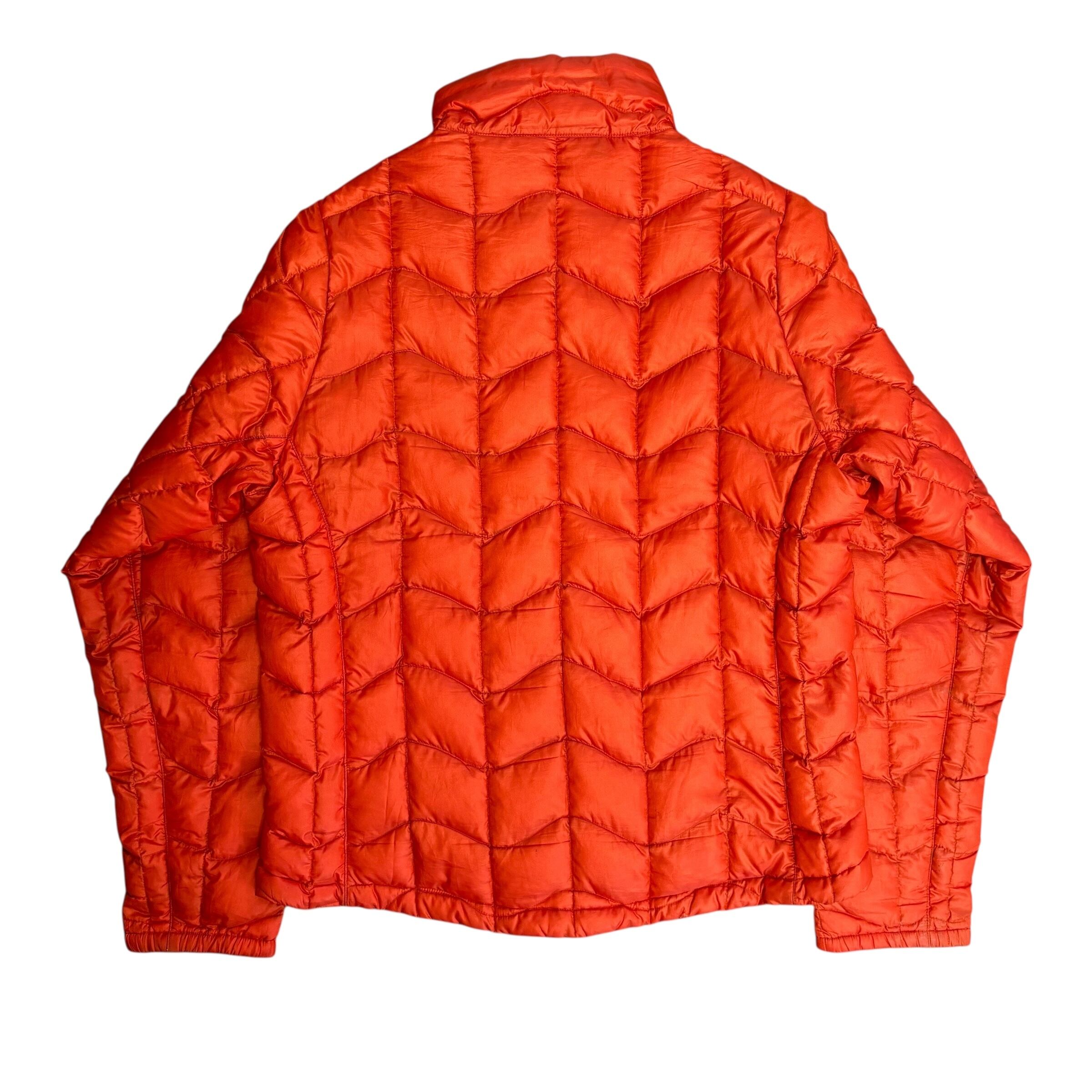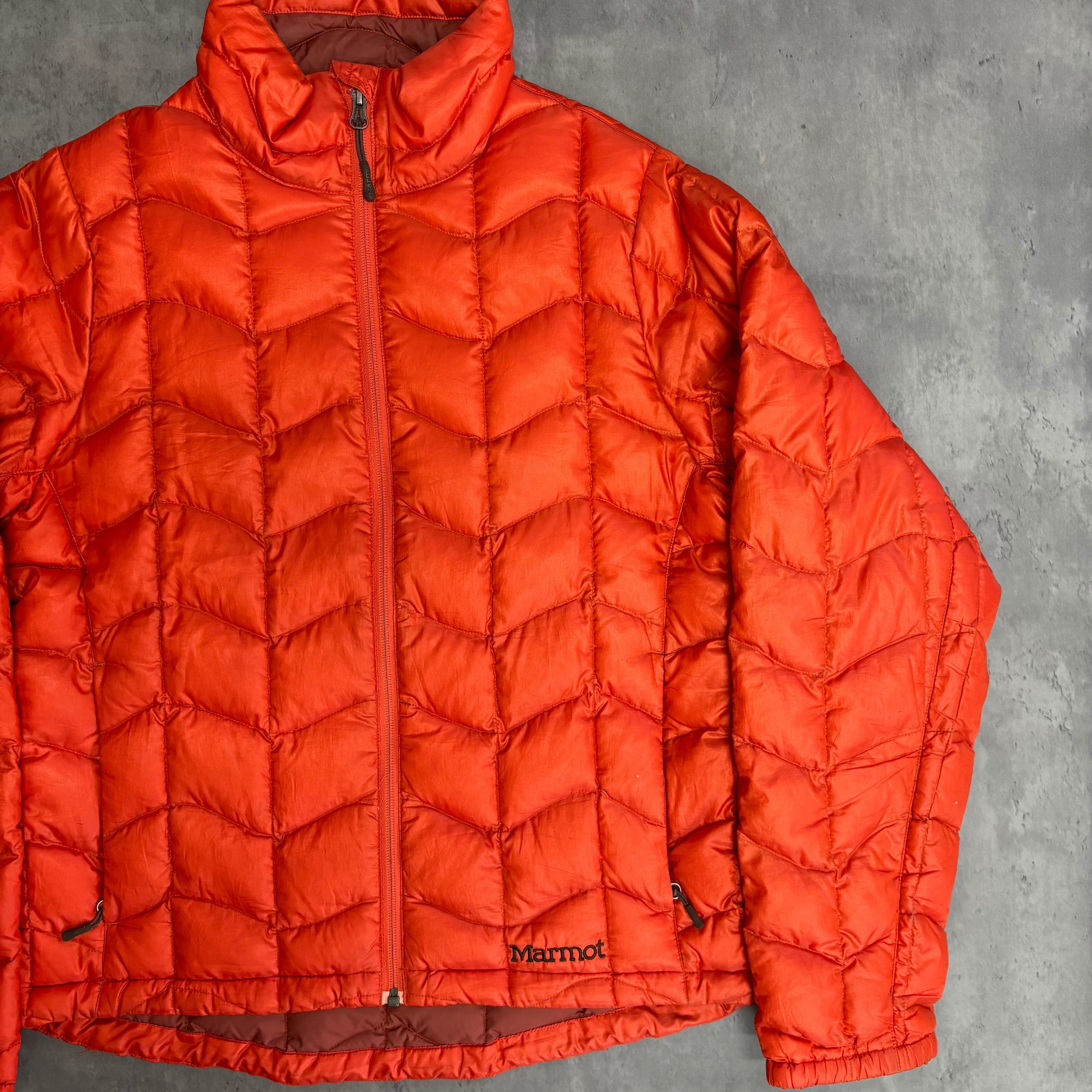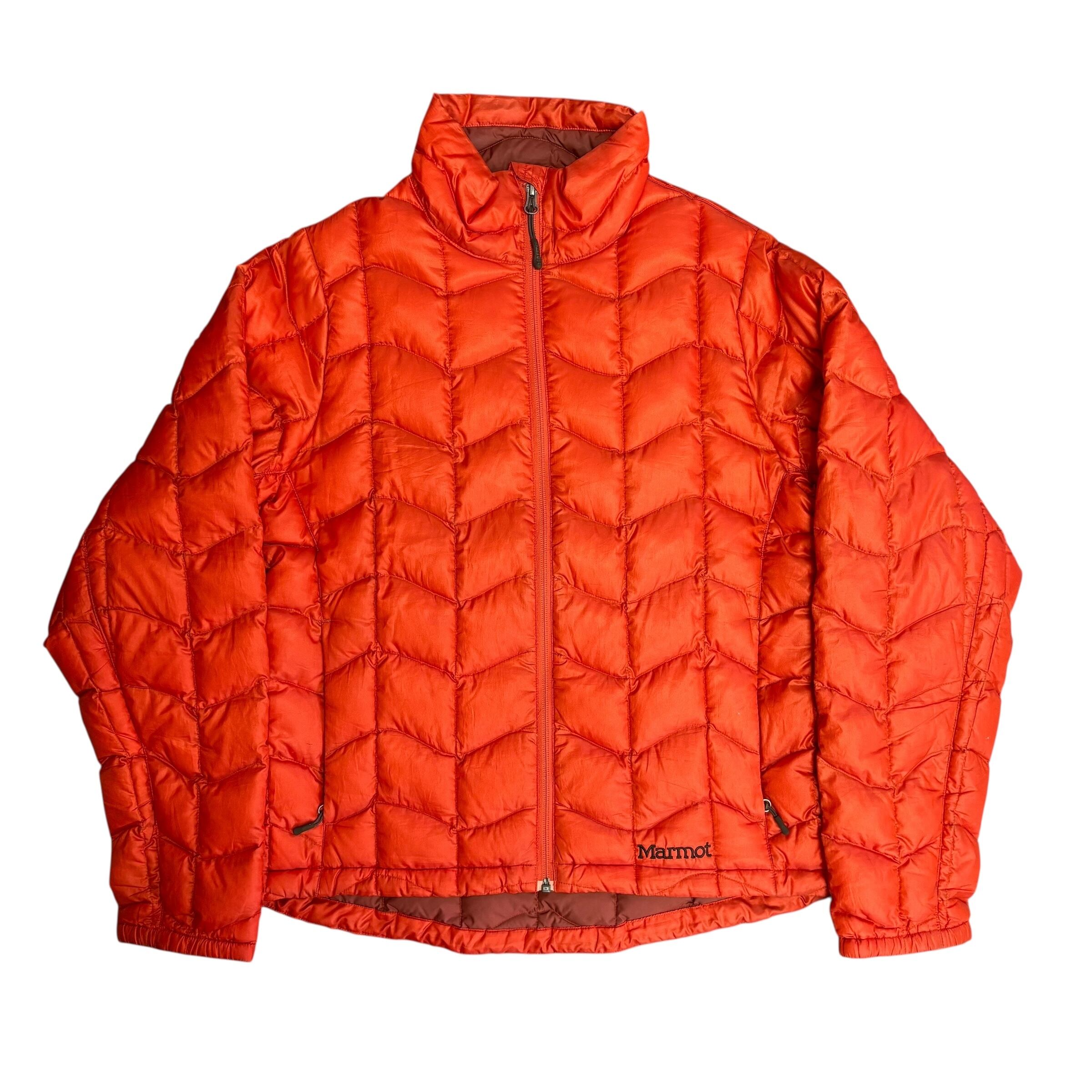 アウトドアブランド Marmot(マーモット) のライトダウンジャケット。鮮やかなオレンジのカラーと、特徴的なシェブロン(V字型)のキルティングが目を引く一着です。軽量で保温性に優れ、街着からアウトドアシーンまで幅広く活躍してくれます。