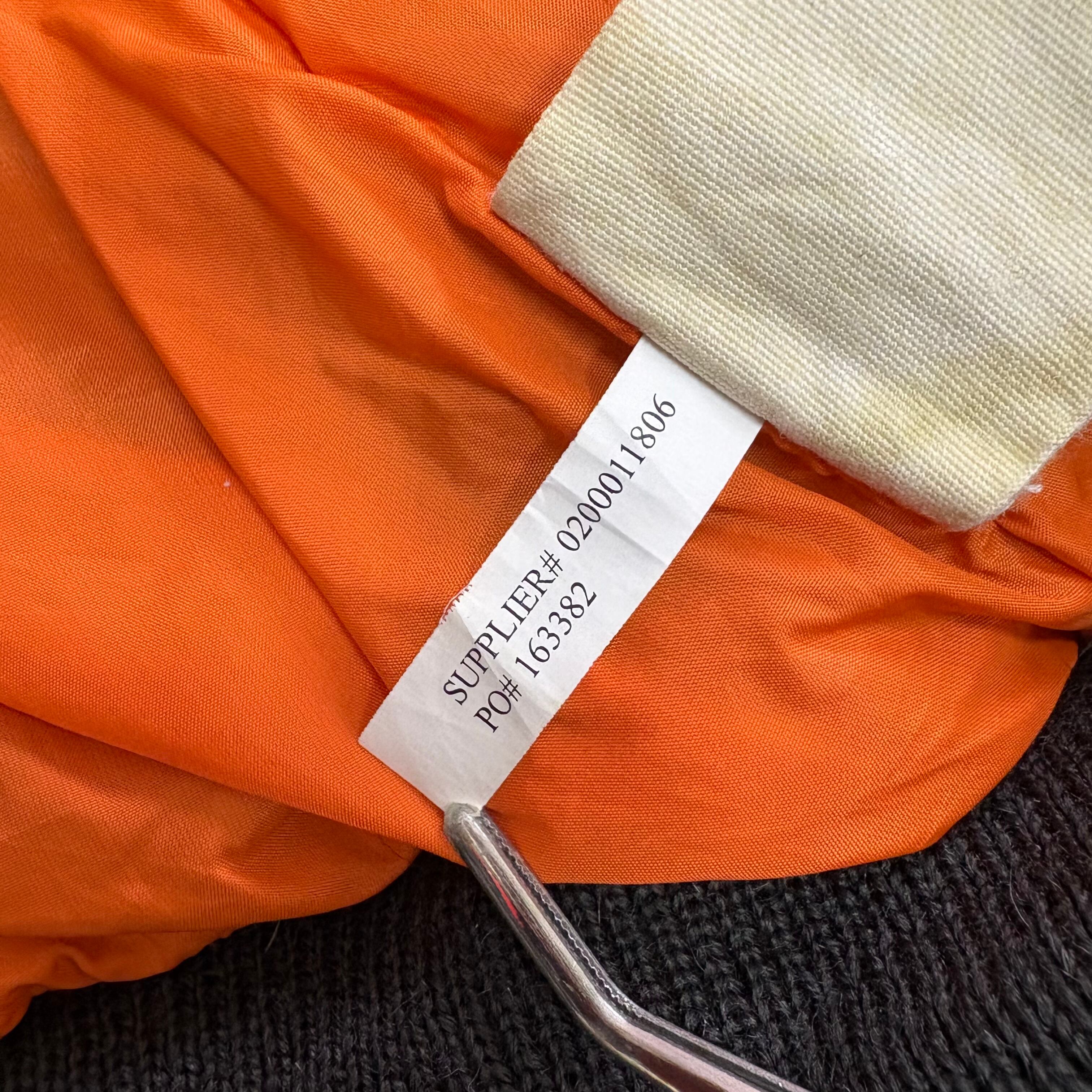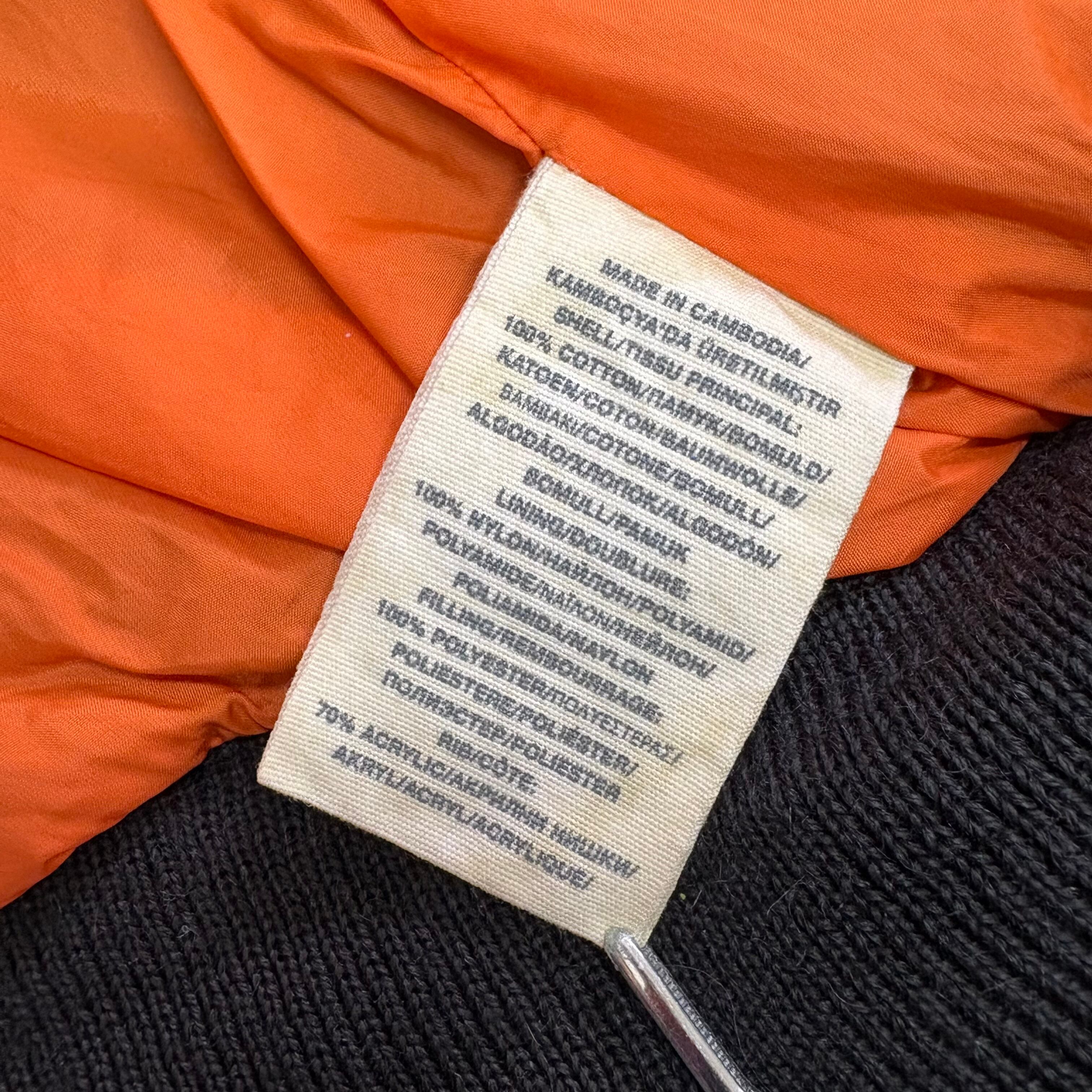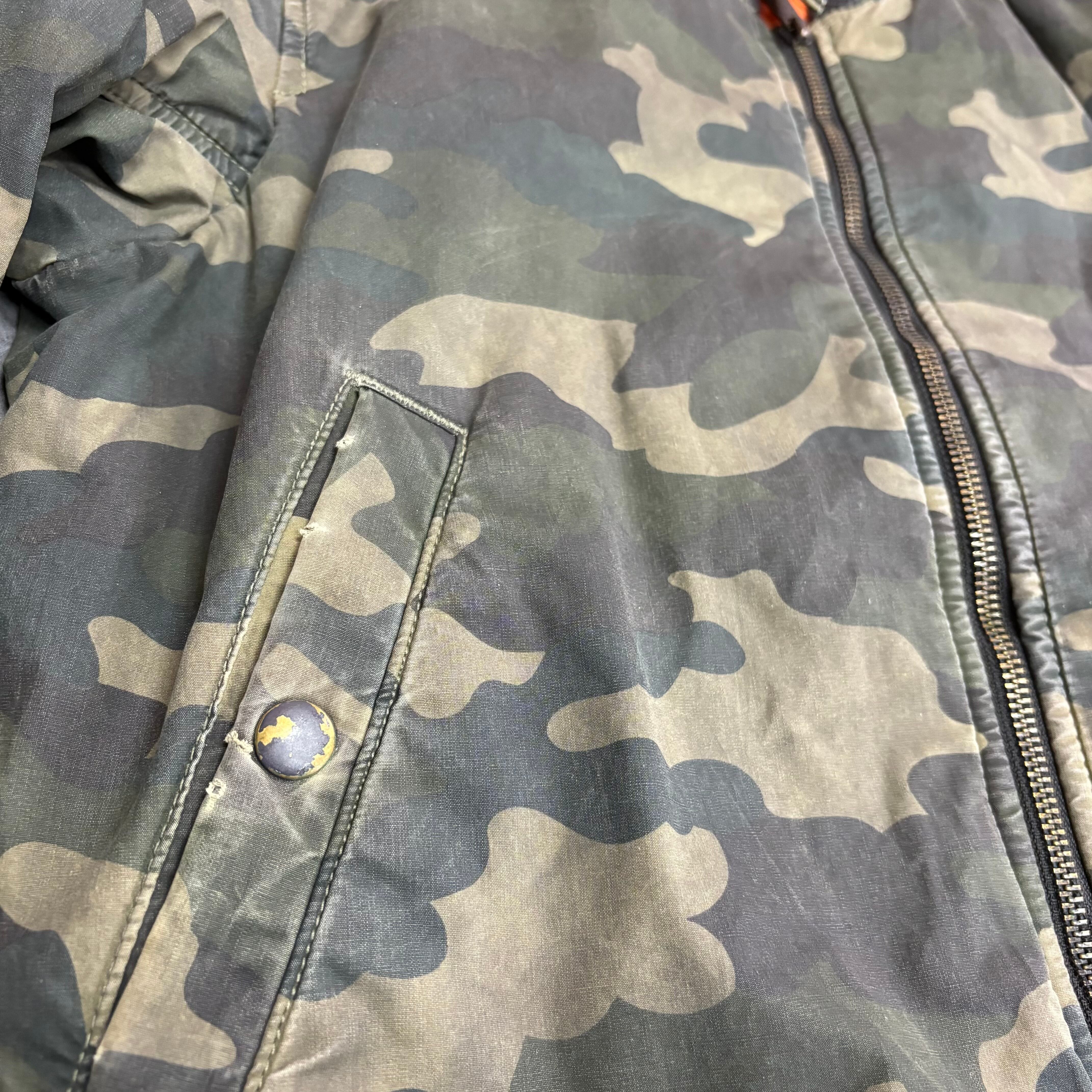 アメリカ軍フライトジャケットをベースにしたデザインで、裏地は鮮やかなレスキューオレンジ。リブやシルエットはクラシックなMA-1の要素を踏襲しつつ、カモ柄で現代的にアレンジされています。