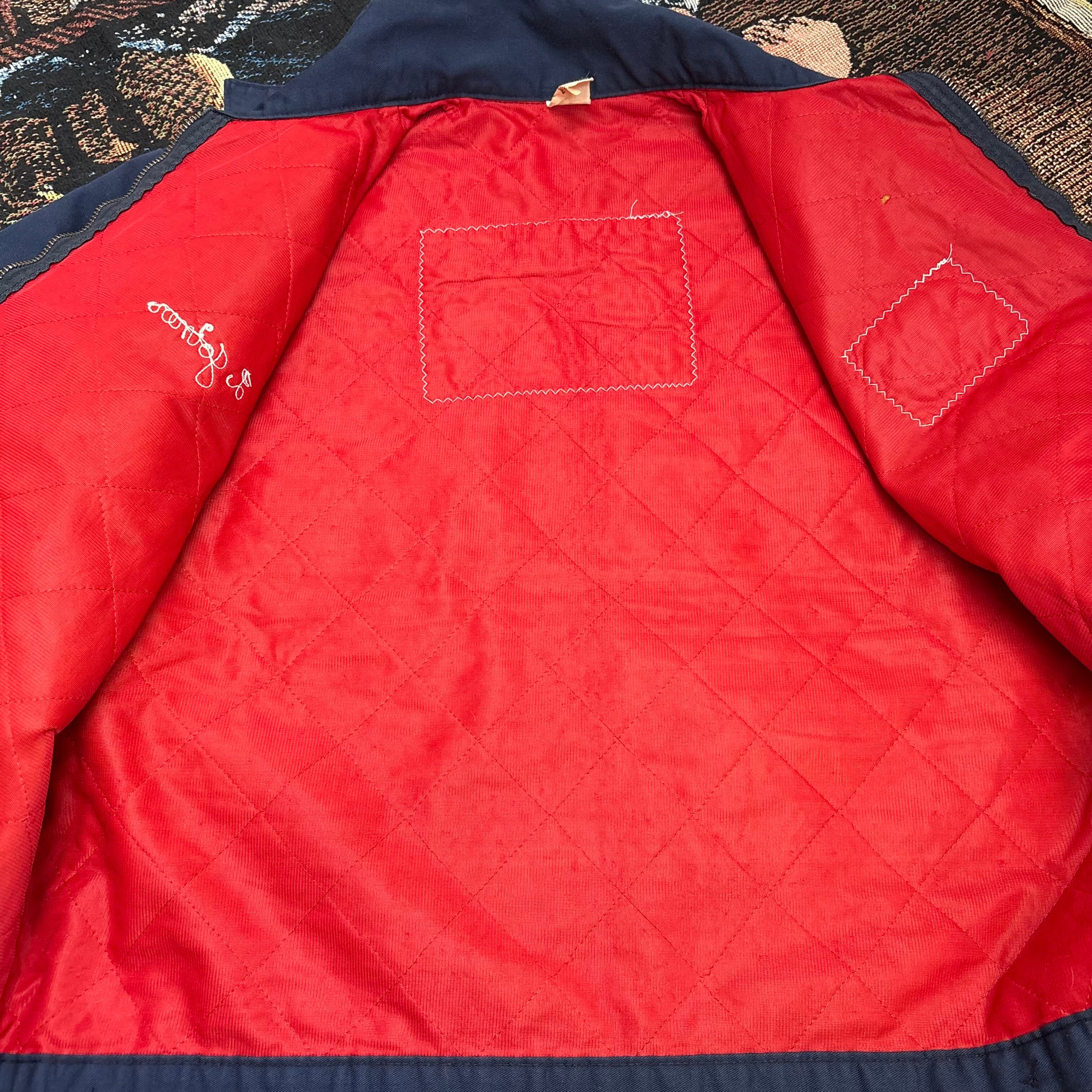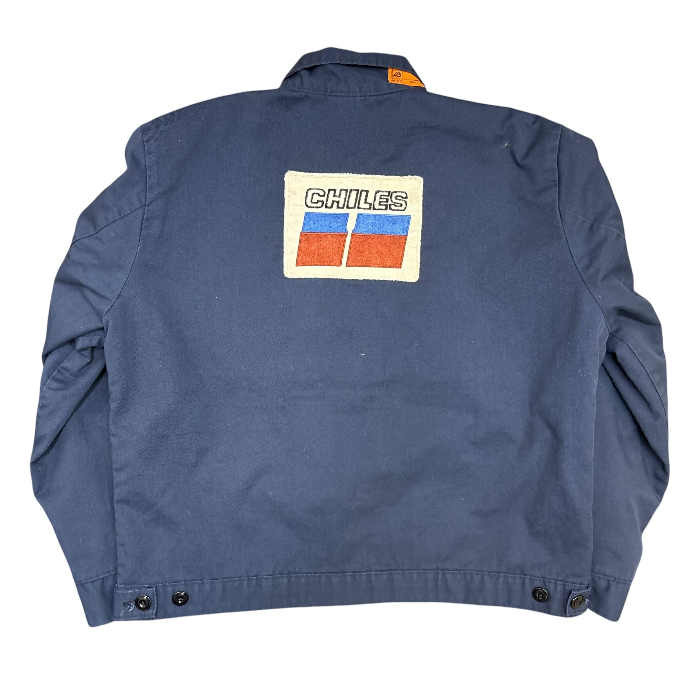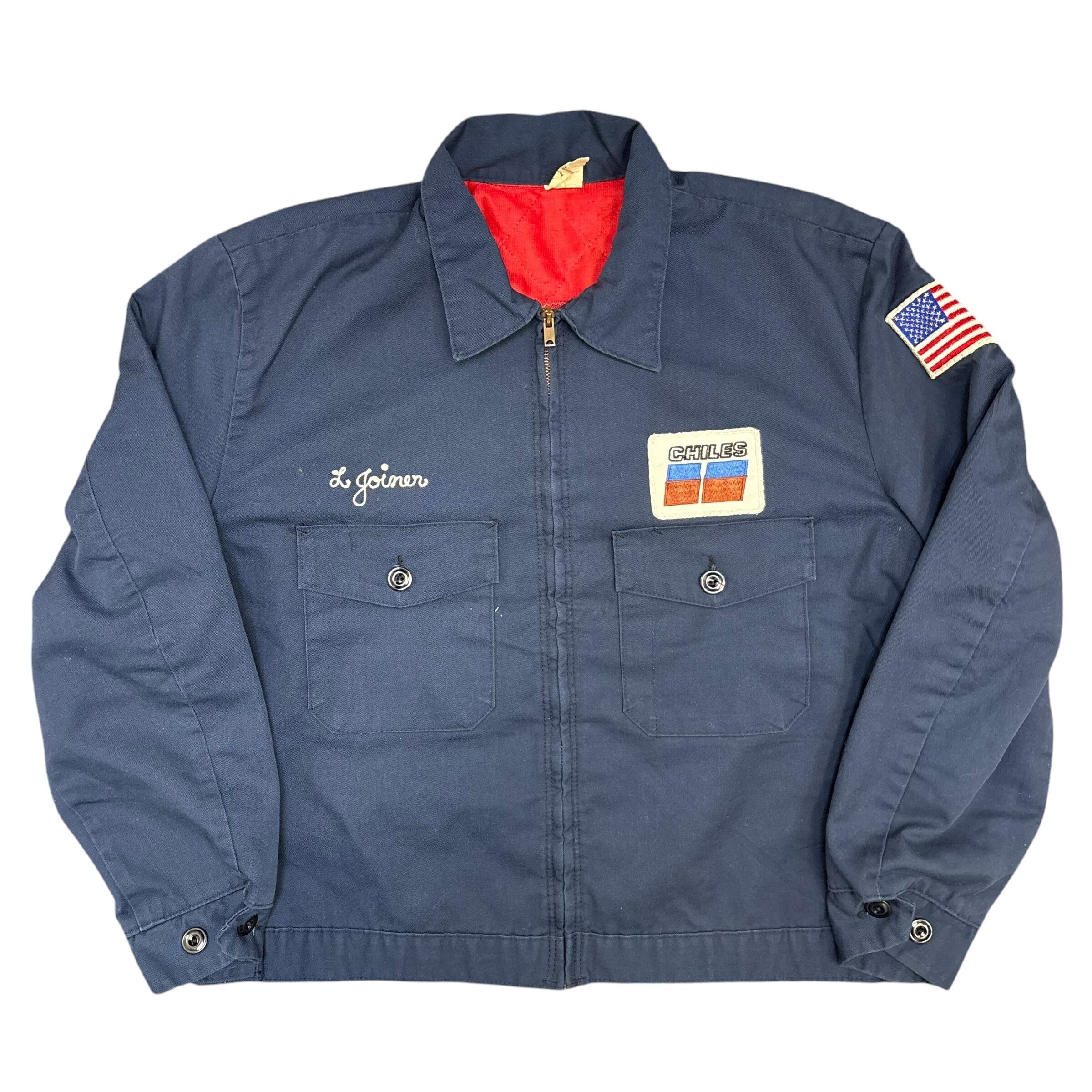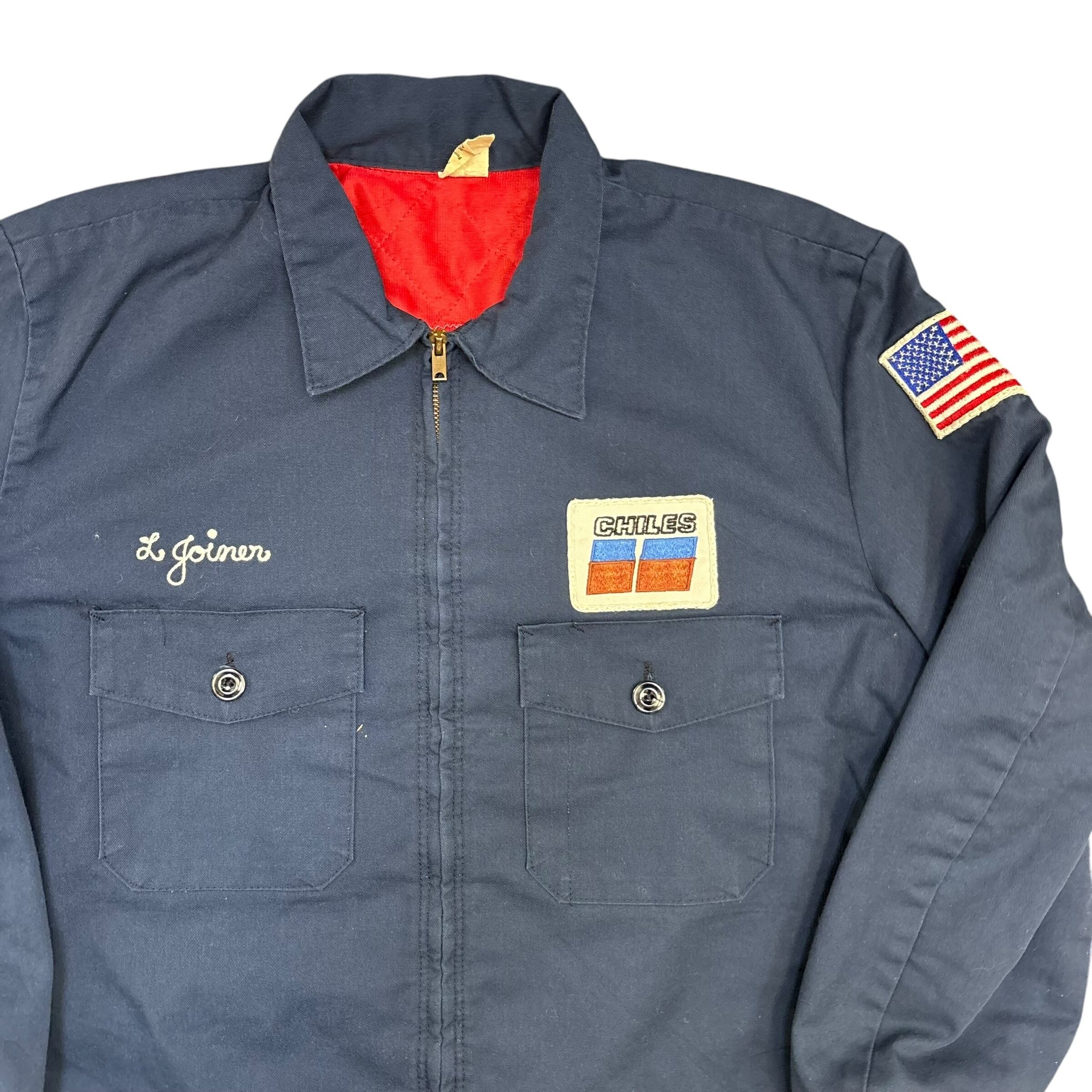 胸には「CHILES」のカンパニーパッチ、袖にはアメリカ国旗のワッペン、そして胸元にネーム刺繍入りと、まさに一点物の企業ユニフォームスタイル。内側は鮮やかな赤ライニングで、無骨さの中に遊び心も感じられます。
