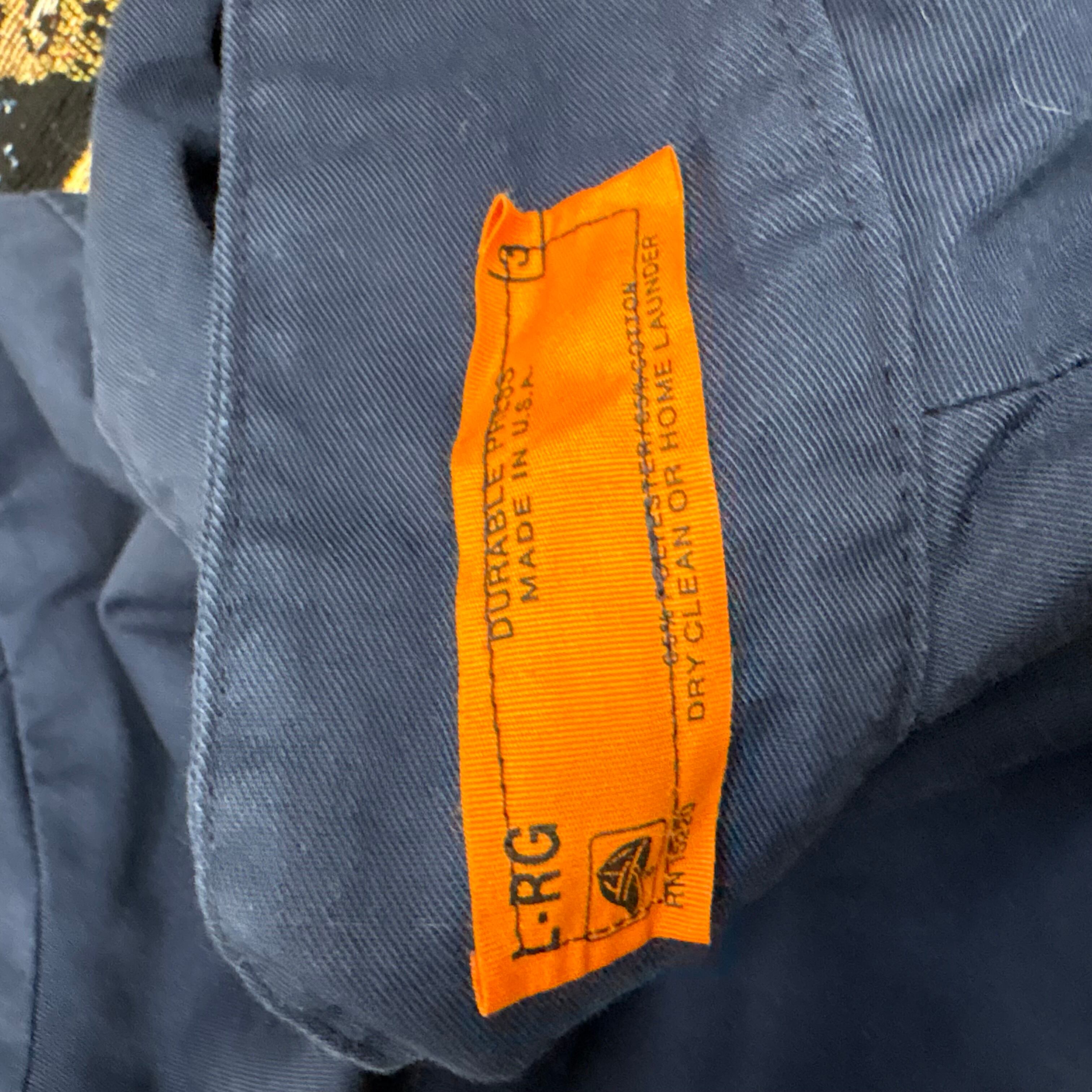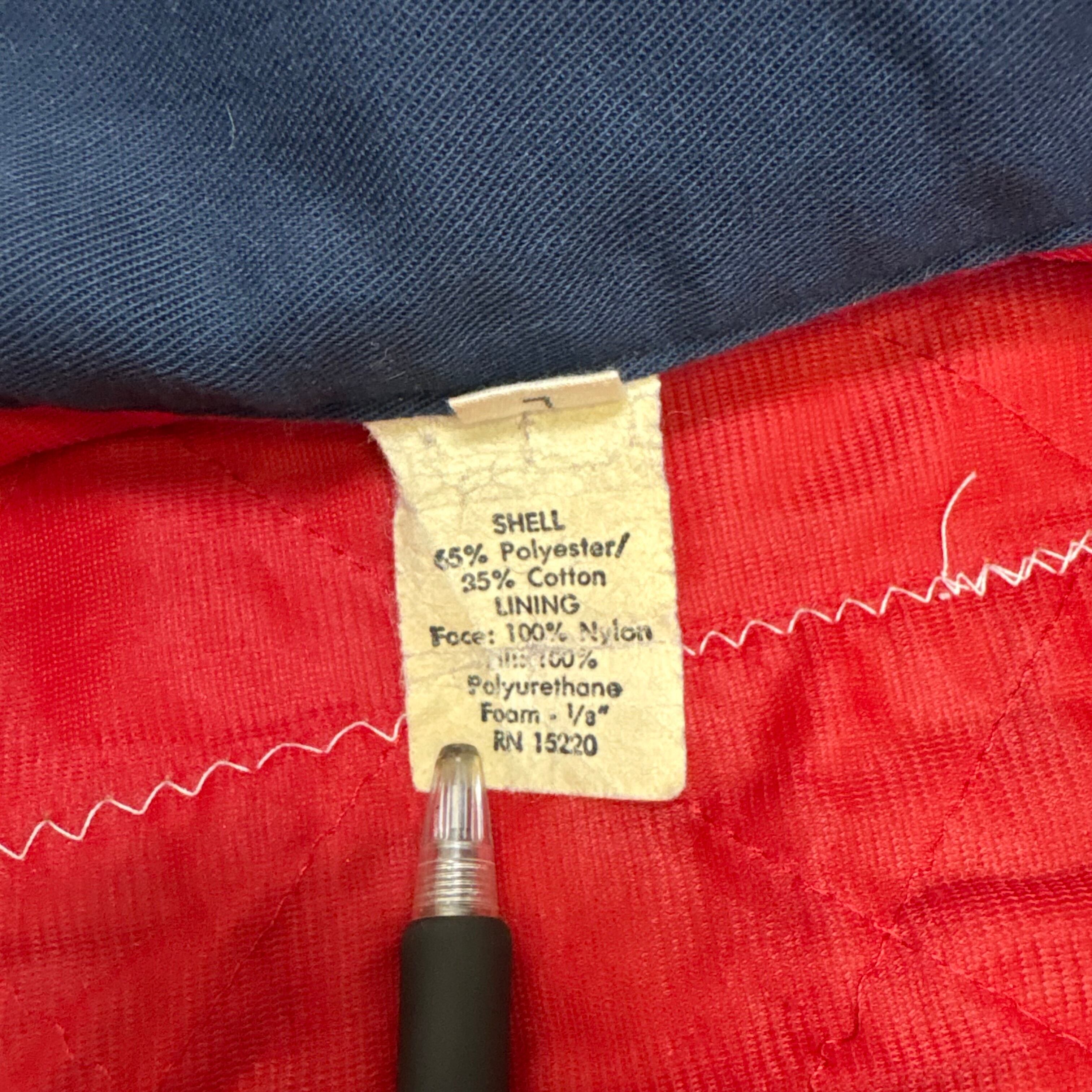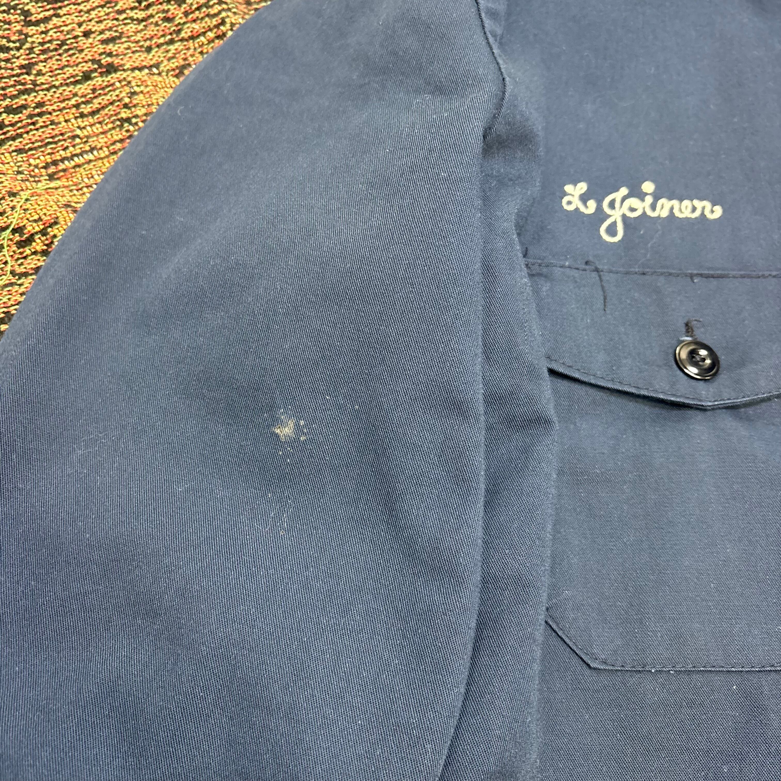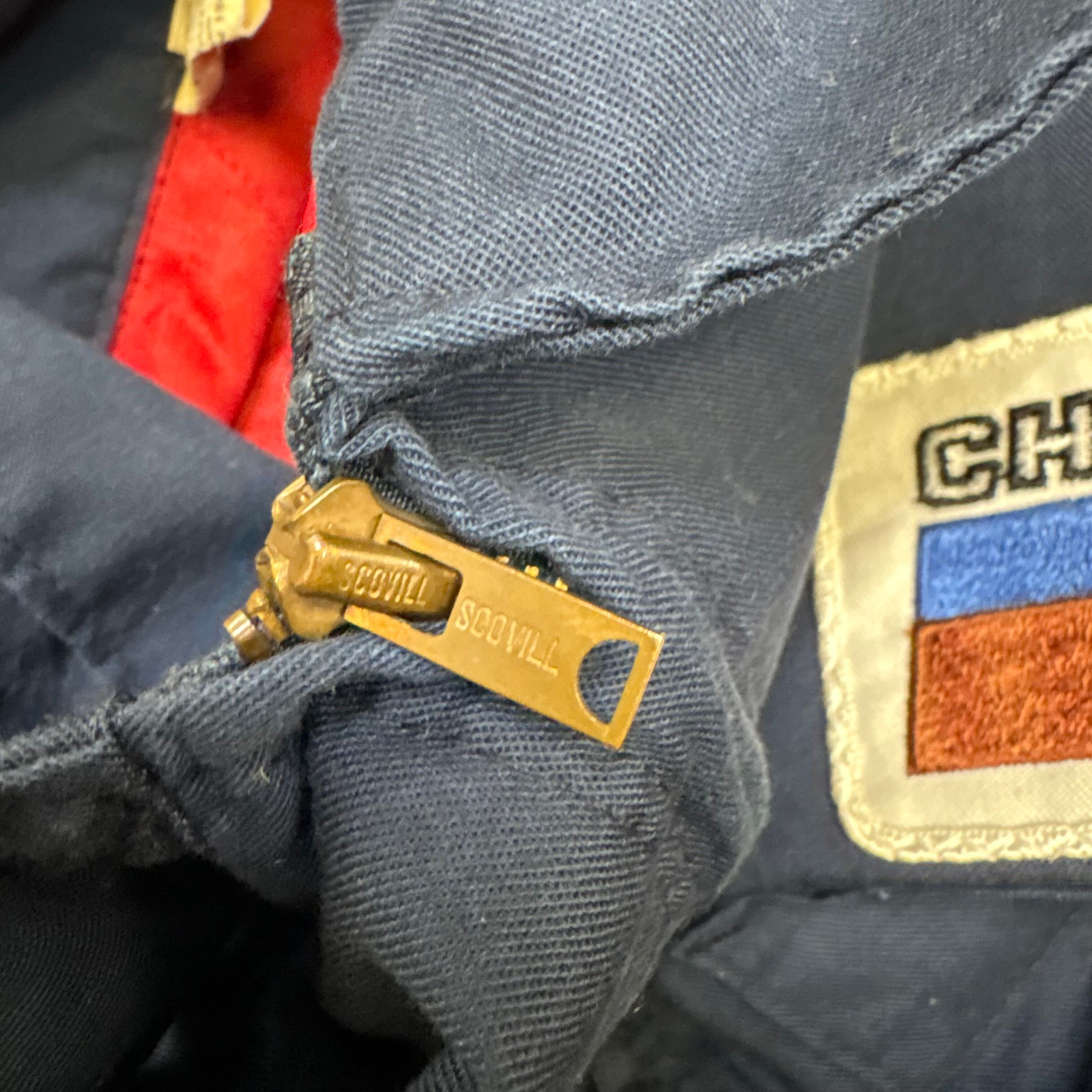 胸には「CHILES」のカンパニーパッチ、袖にはアメリカ国旗のワッペン、そして胸元にネーム刺繍入りと、まさに一点物の企業ユニフォームスタイル。内側は鮮やかな赤ライニングで、無骨さの中に遊び心も感じられます。