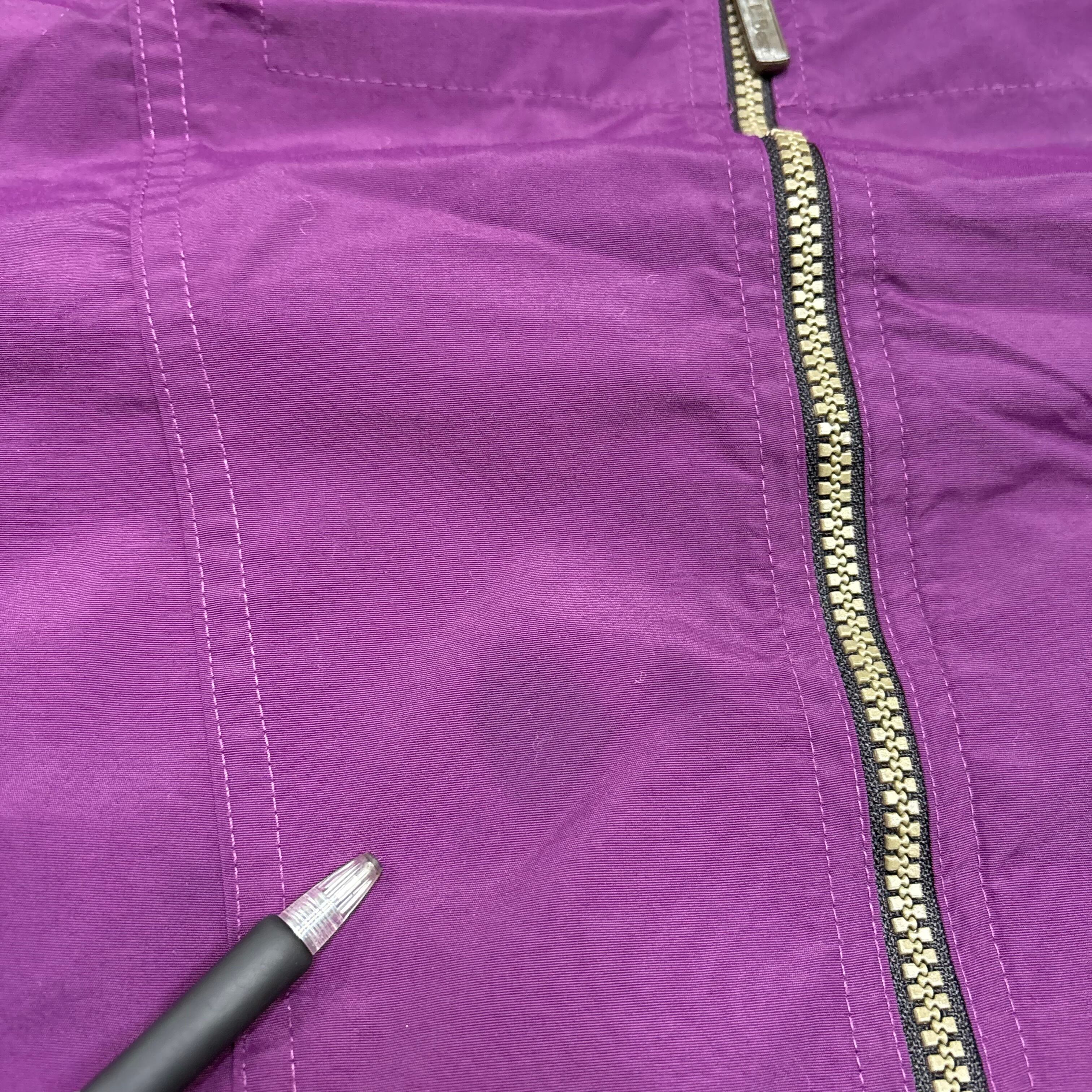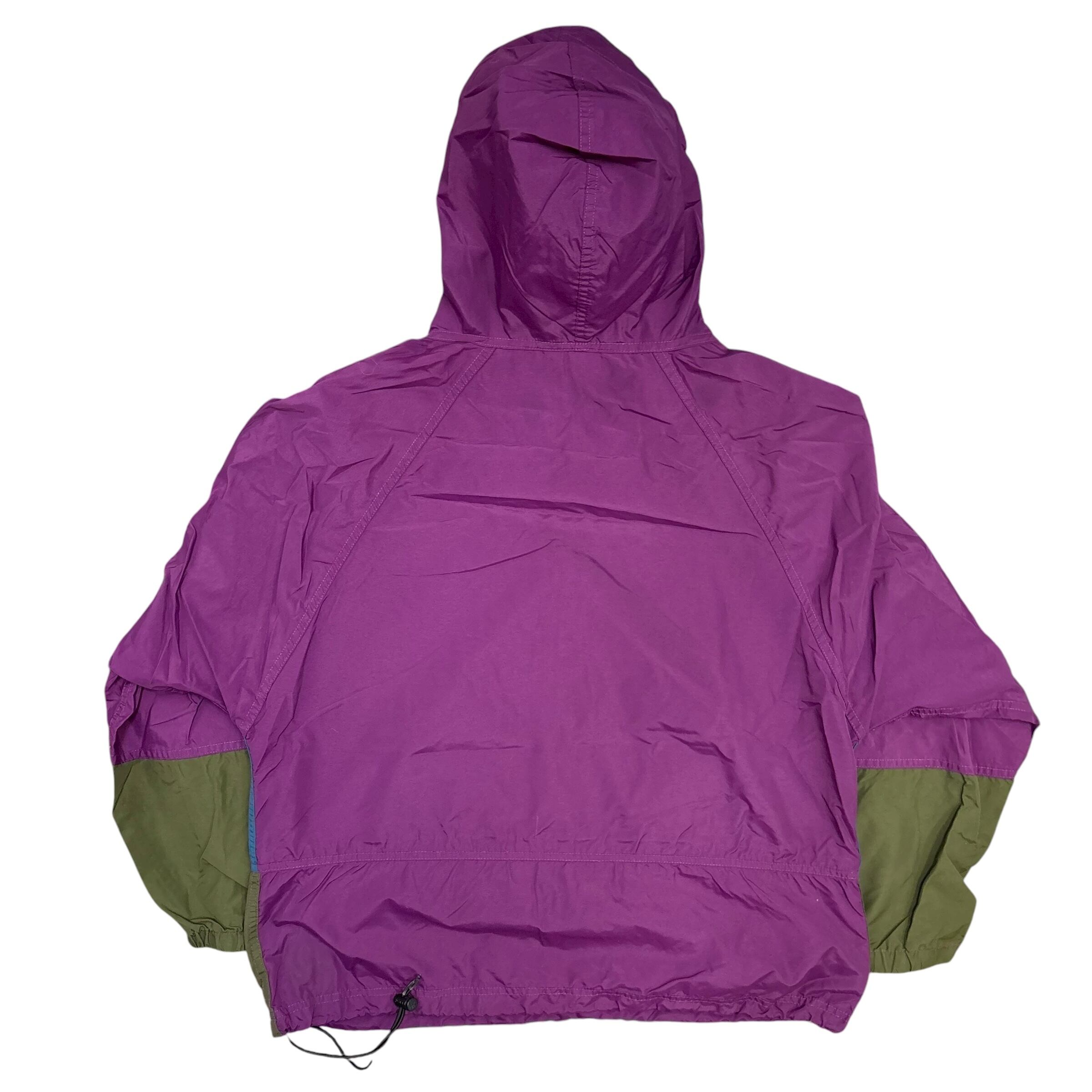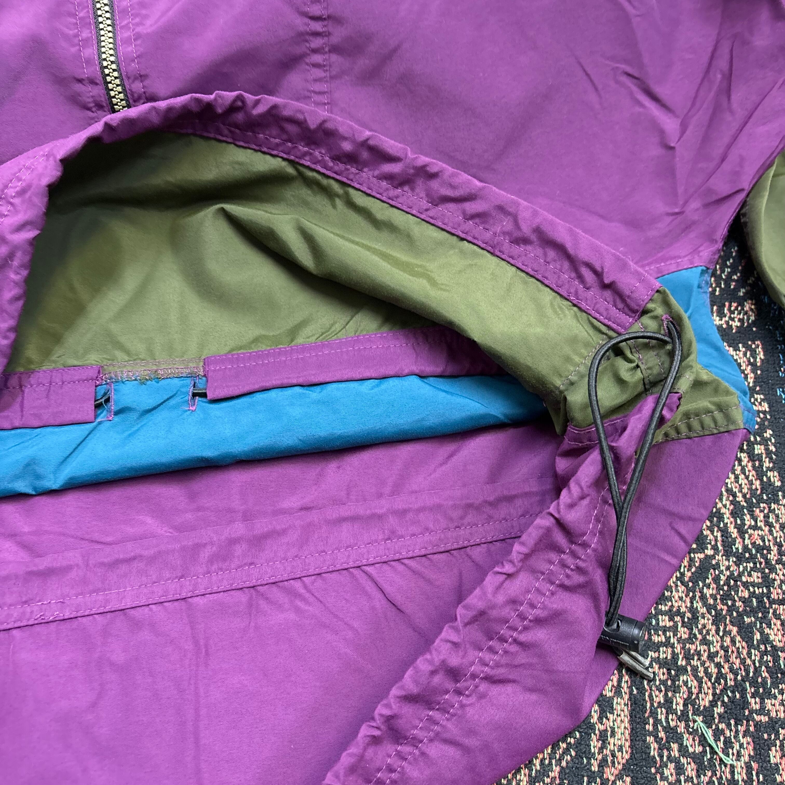 パープルを基調に、ターコイズブルーとオリーブを切り替えた大胆なカラーリングが特徴です。フロントのジップ付きカンガルーポケットには幾何学模様のテープデザインが入り、遊び心の効いたディテールが目を引きます。軽量ナイロン素材でタウンユースからフェスやアウトドアシーンまで幅広く活躍してくれる一着です。