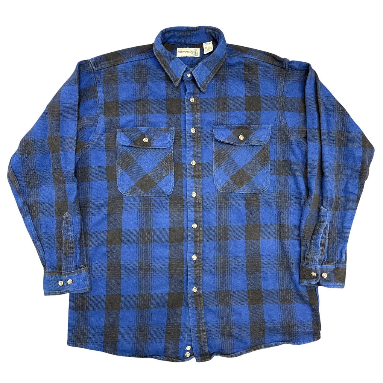 ブルー×ブラックの大判チェックが映える一枚で、程よい厚みのコットンフランネル素材が魅力です。クラシックなワークスタイルはもちろん、90sライクなストリートコーデにも取り入れやすい万能アイテム。