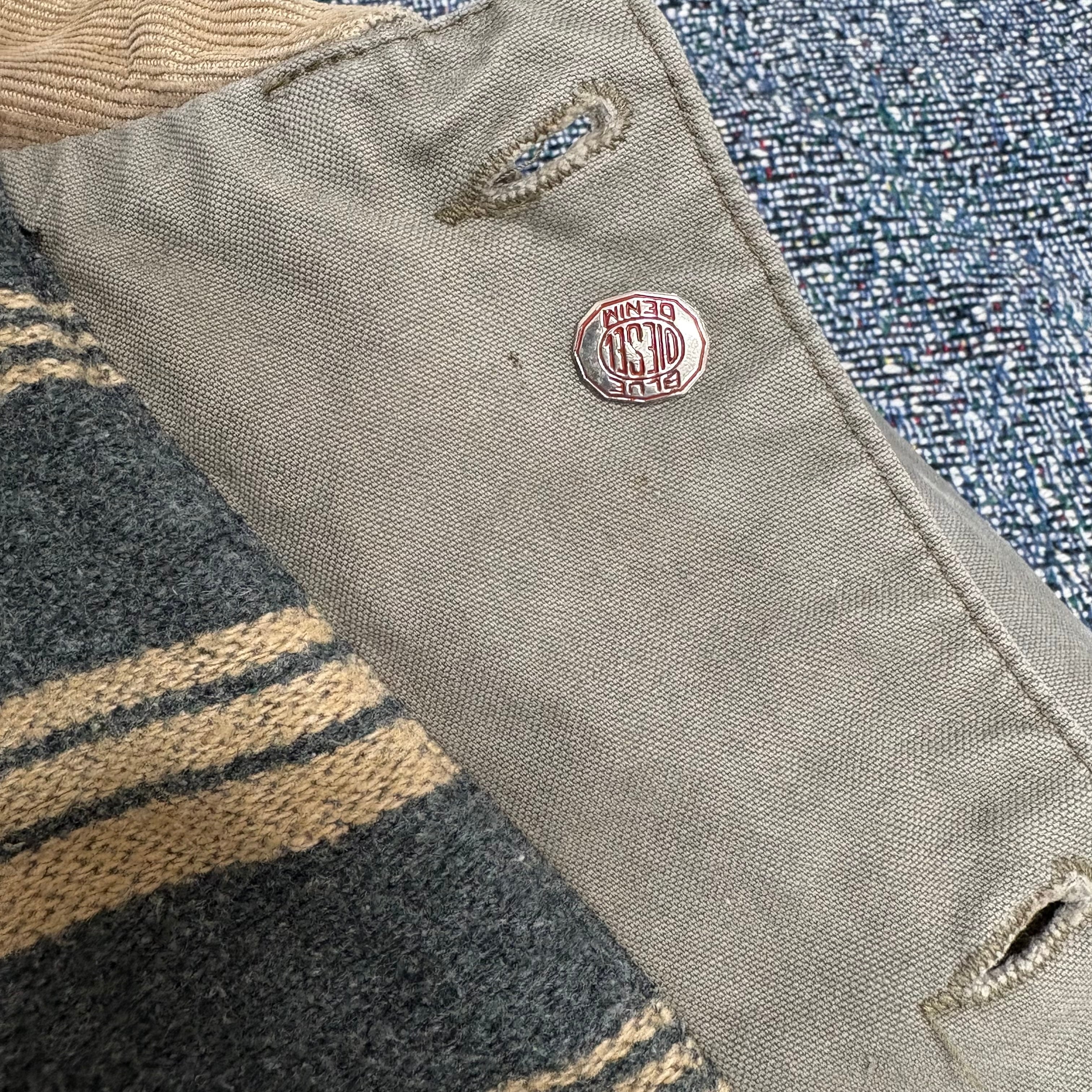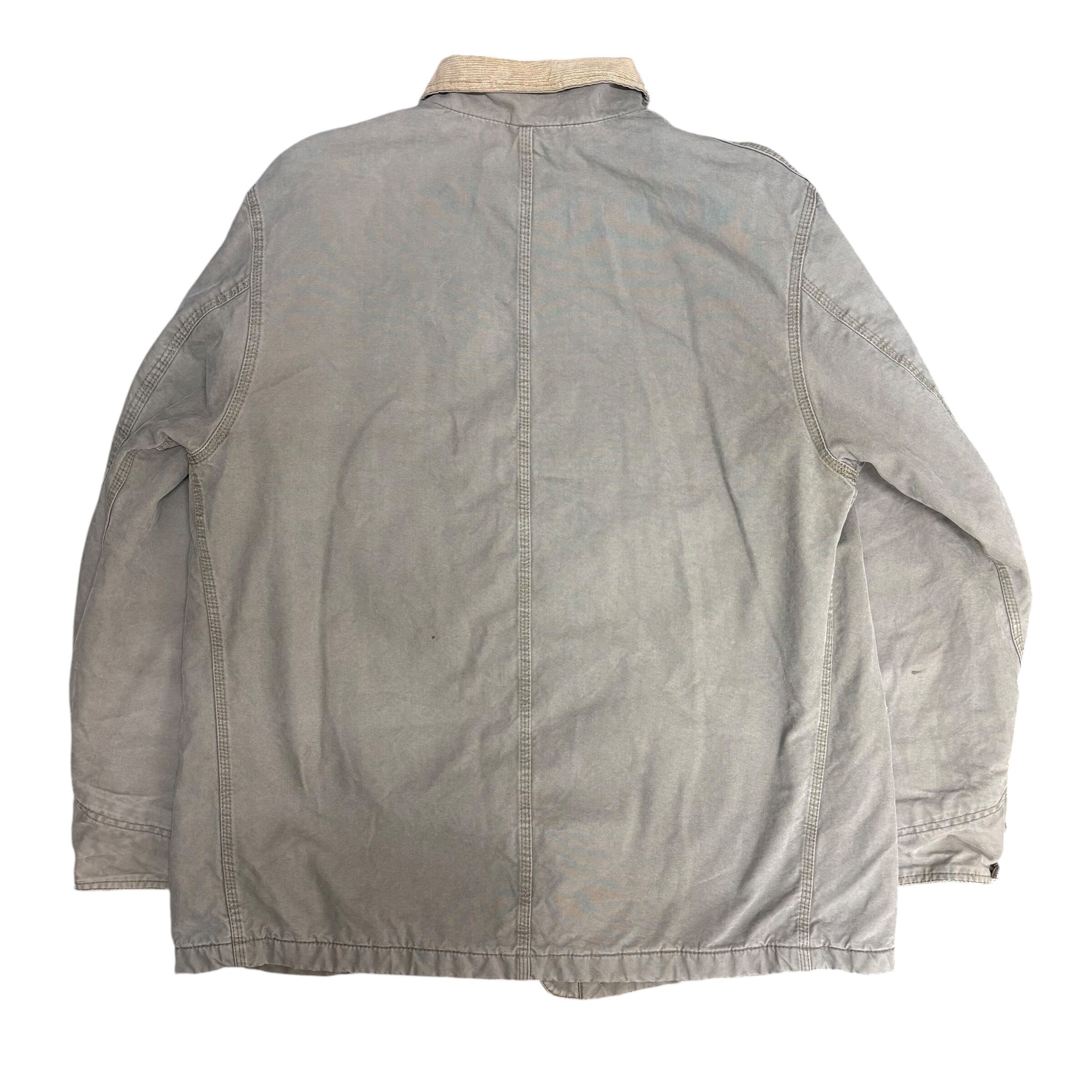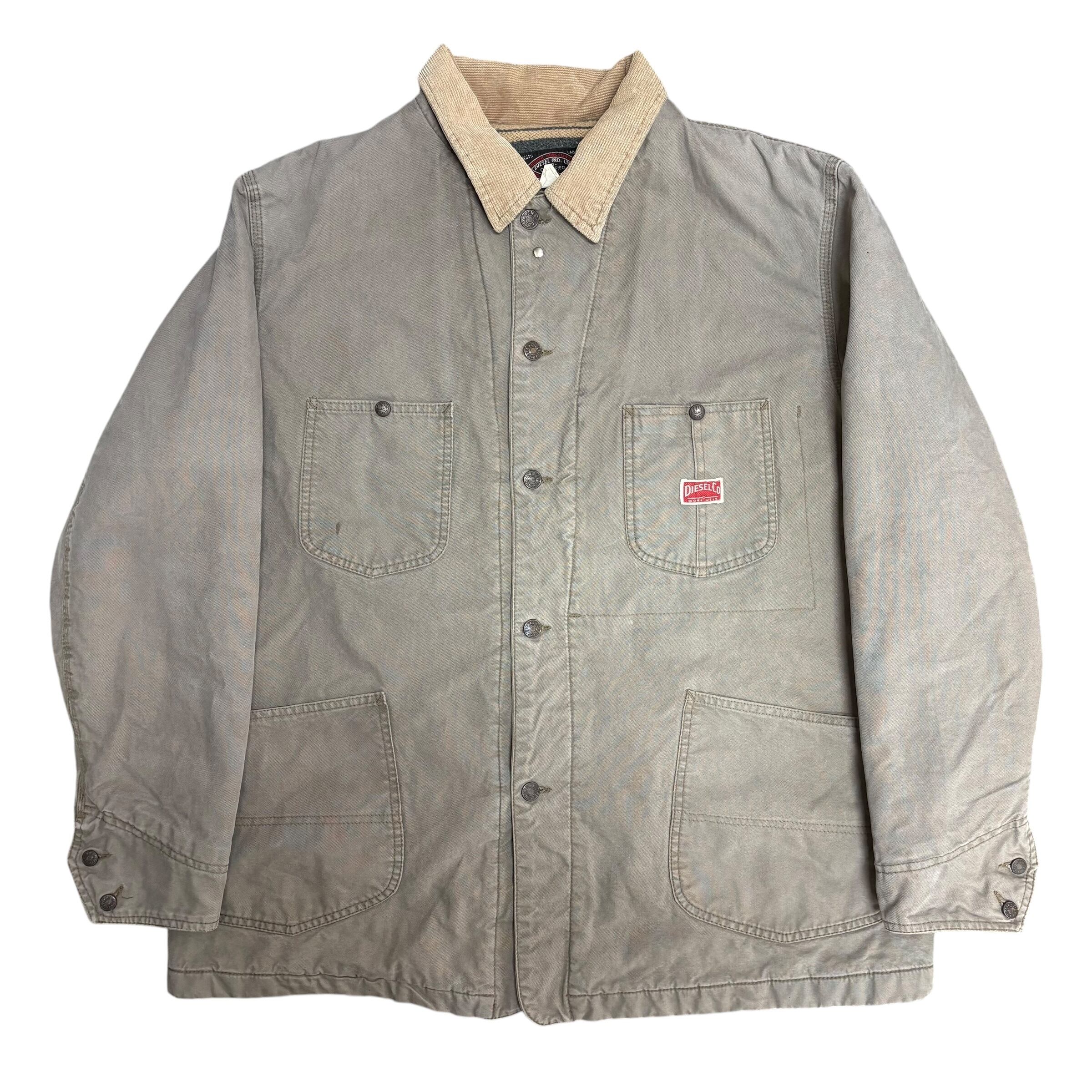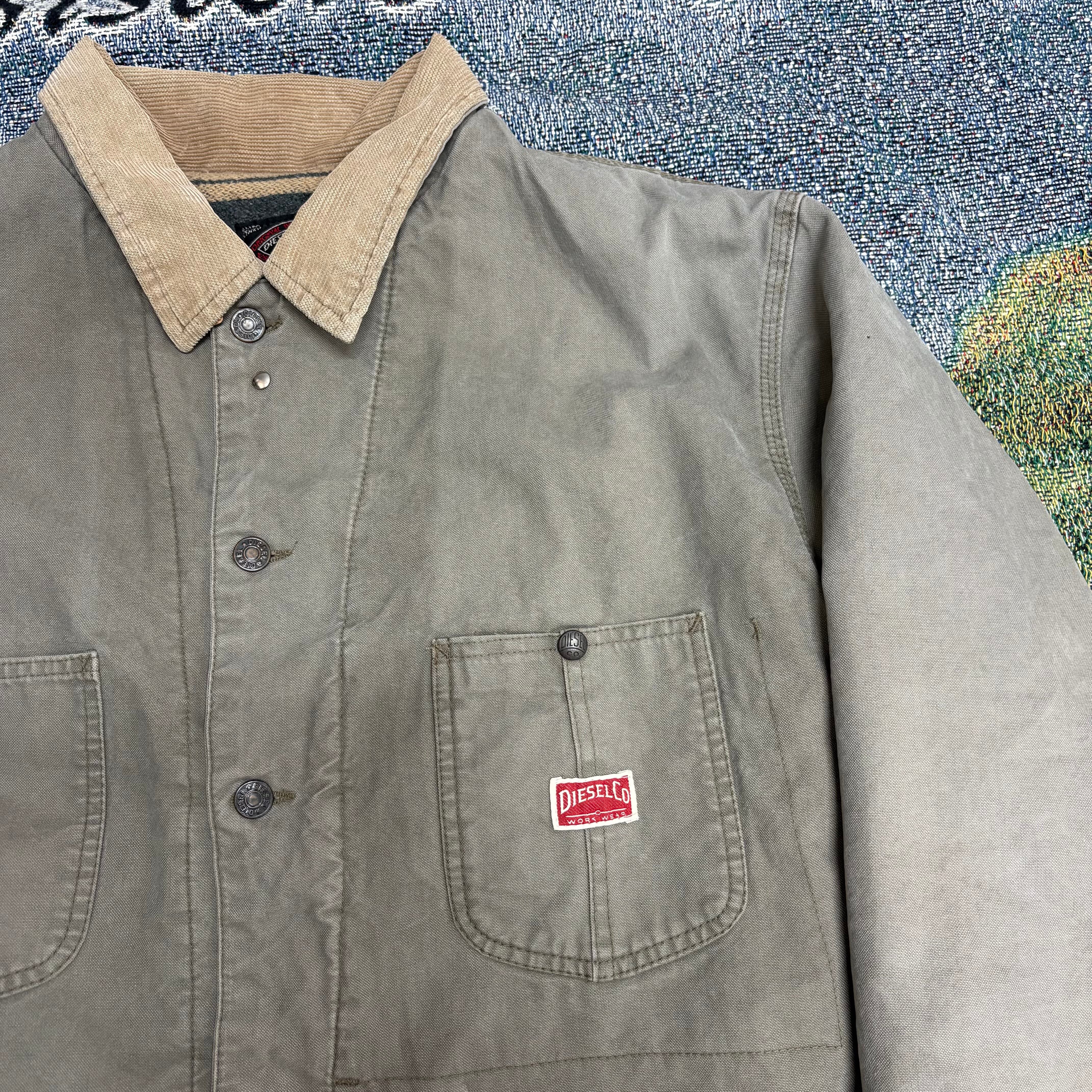DIESELが90’s〜初期2000’sに展開していたワークライン。洗いのかかったコットンシェルにコーデュロイ襟、胸の赤タグが効いた“飾らない格好良さ”。オリーブグレイのフェードがいいムードで、ミリタリー〜スケータースタイルまで受け止めます。