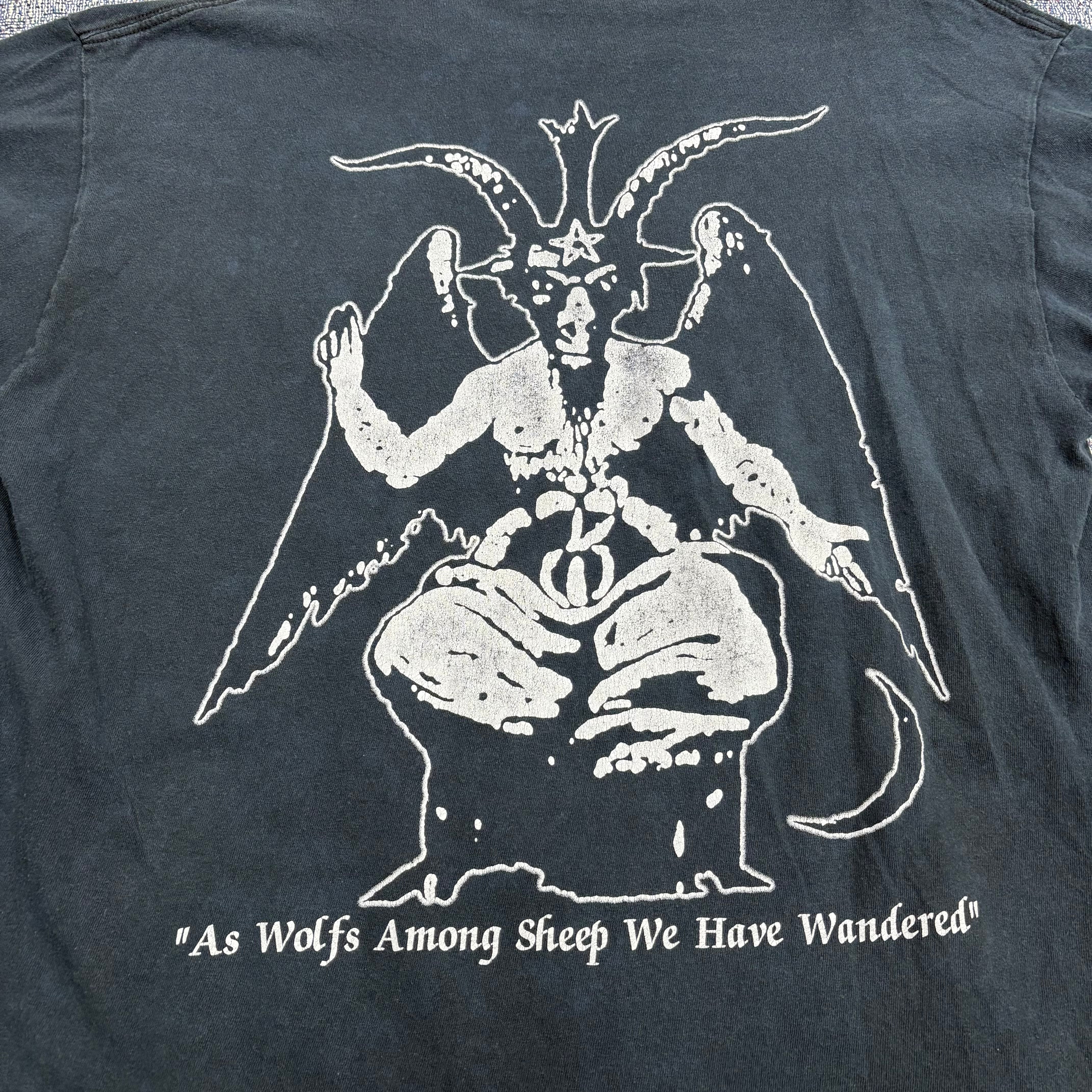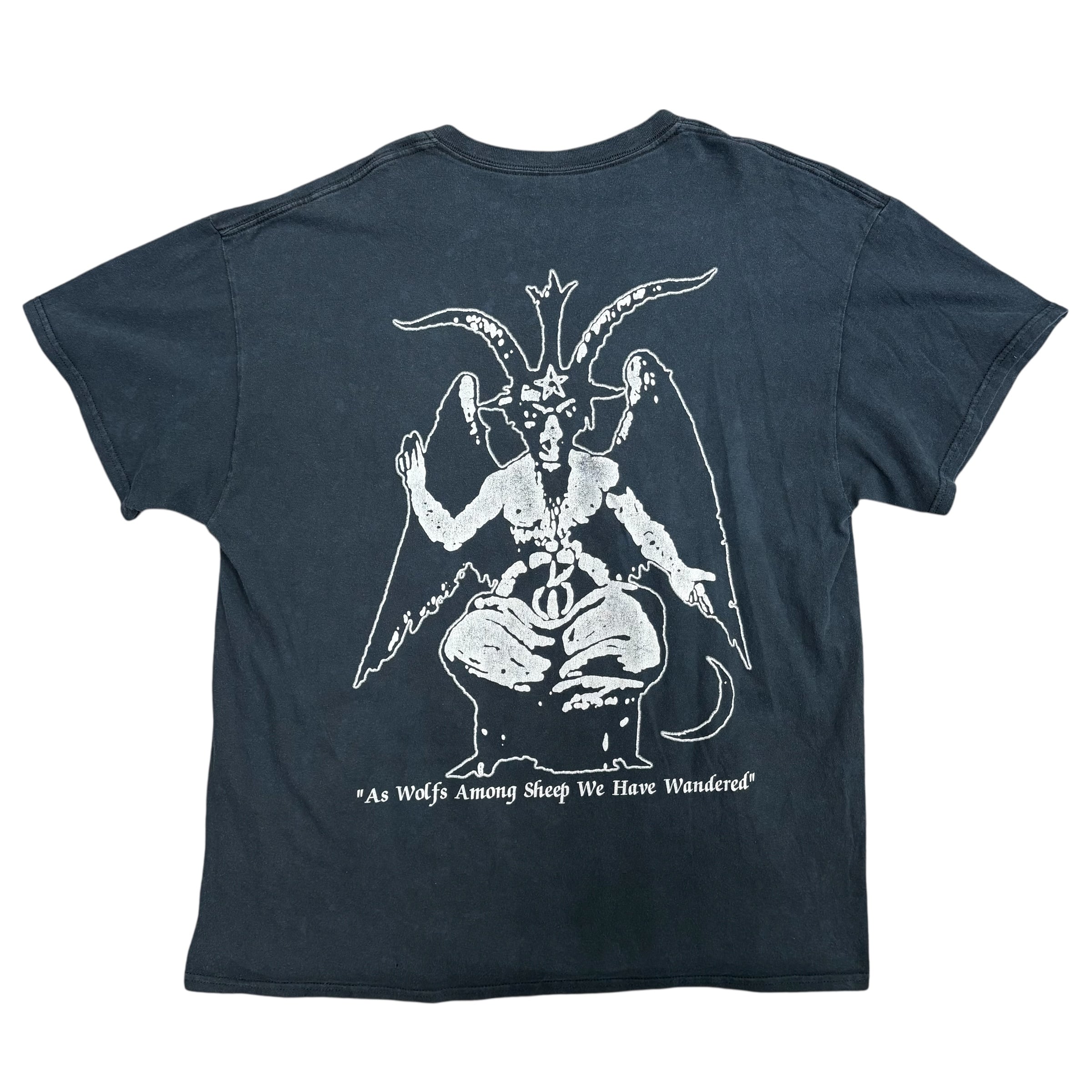 フロントは滲み崩れたようなバンドロゴのみを大きく載せたミニマルな構成で、ジャンル特有の退廃的な空気がしっかり出た一枚です。無駄な装飾を削ぎ落としたフロントに対して、バックには山羊頭のバフォメット調グラフィックと “As Wolfs Among Sheep We Have Wandered” のメッセージ入り。前後で世界観がしっかり完成していて、ブラックメタルTらしい妖しさと迫力を兼ね備えています。