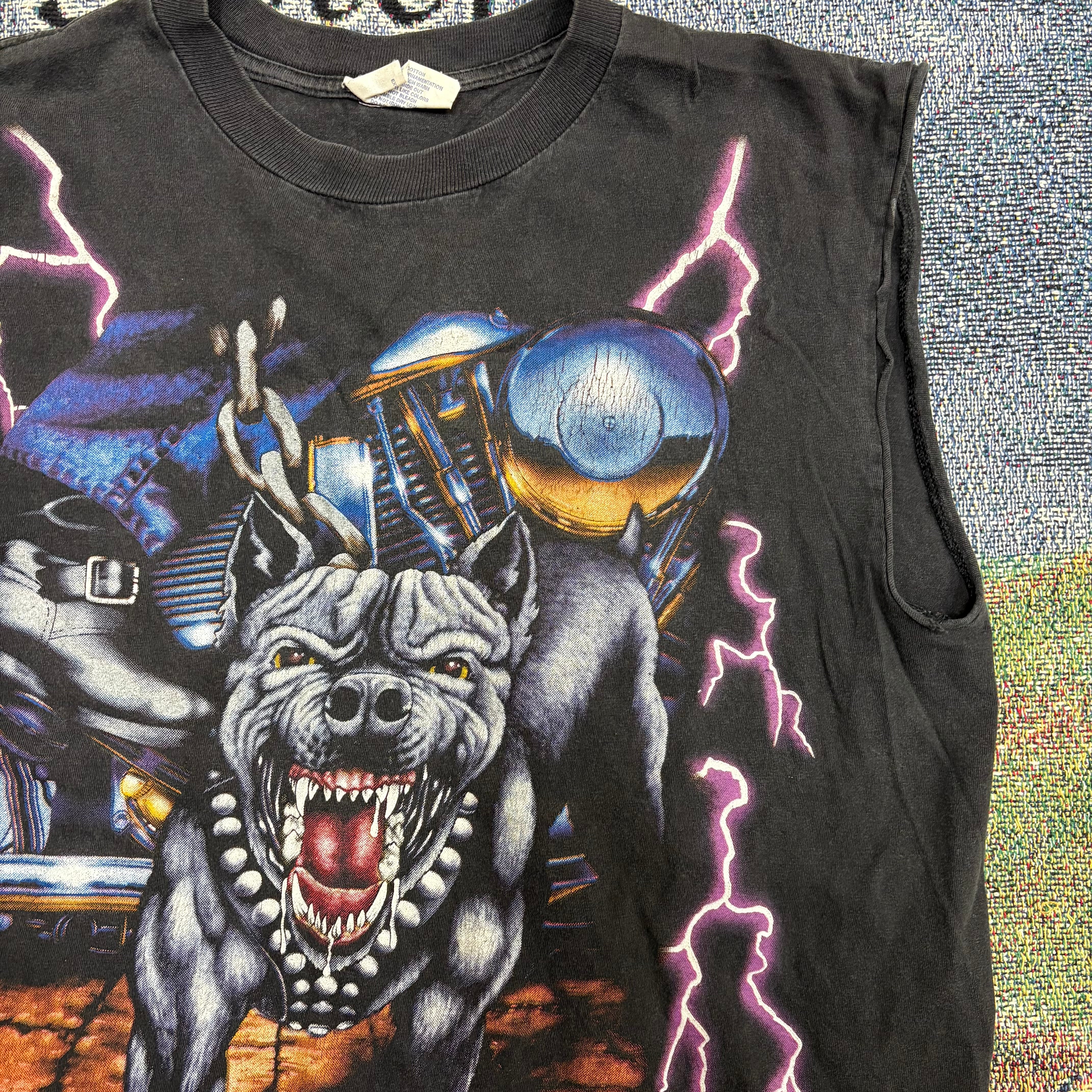 フロントにはチェーンにつながれたピットブルが迫り出す迫力あるデザイン。筋肉質な体や鋭い牙の描写、メタリックに輝くエンジンの質感など、当時のバイカーT特有のハードな世界観が詰まった一枚です。