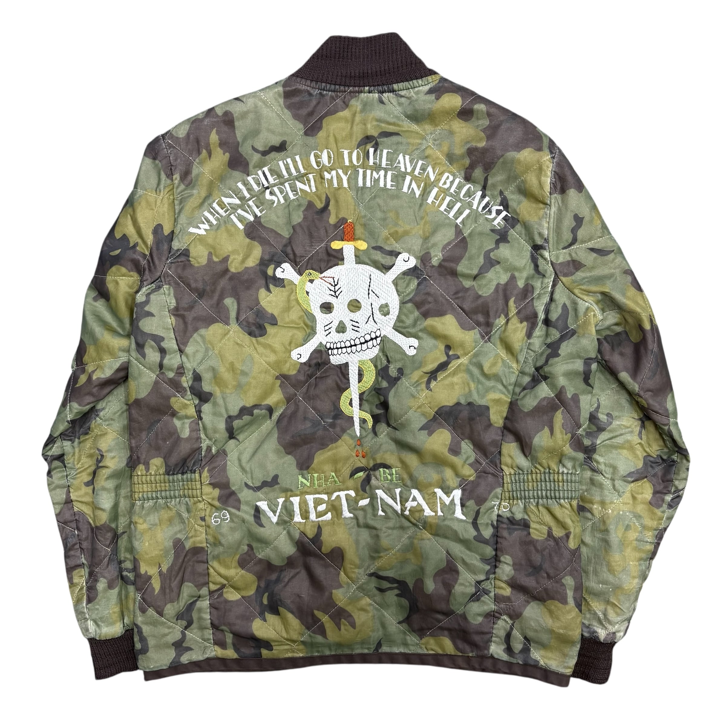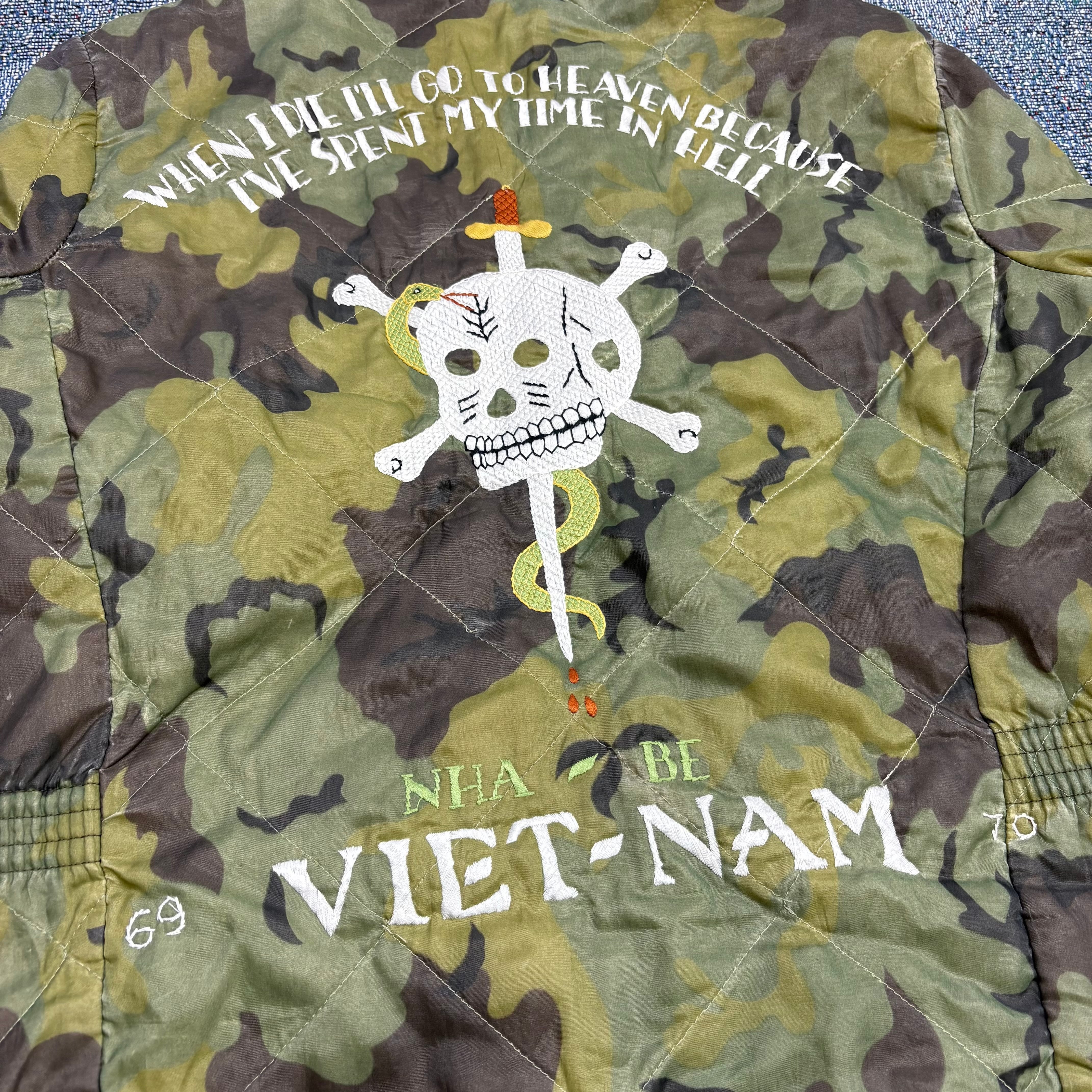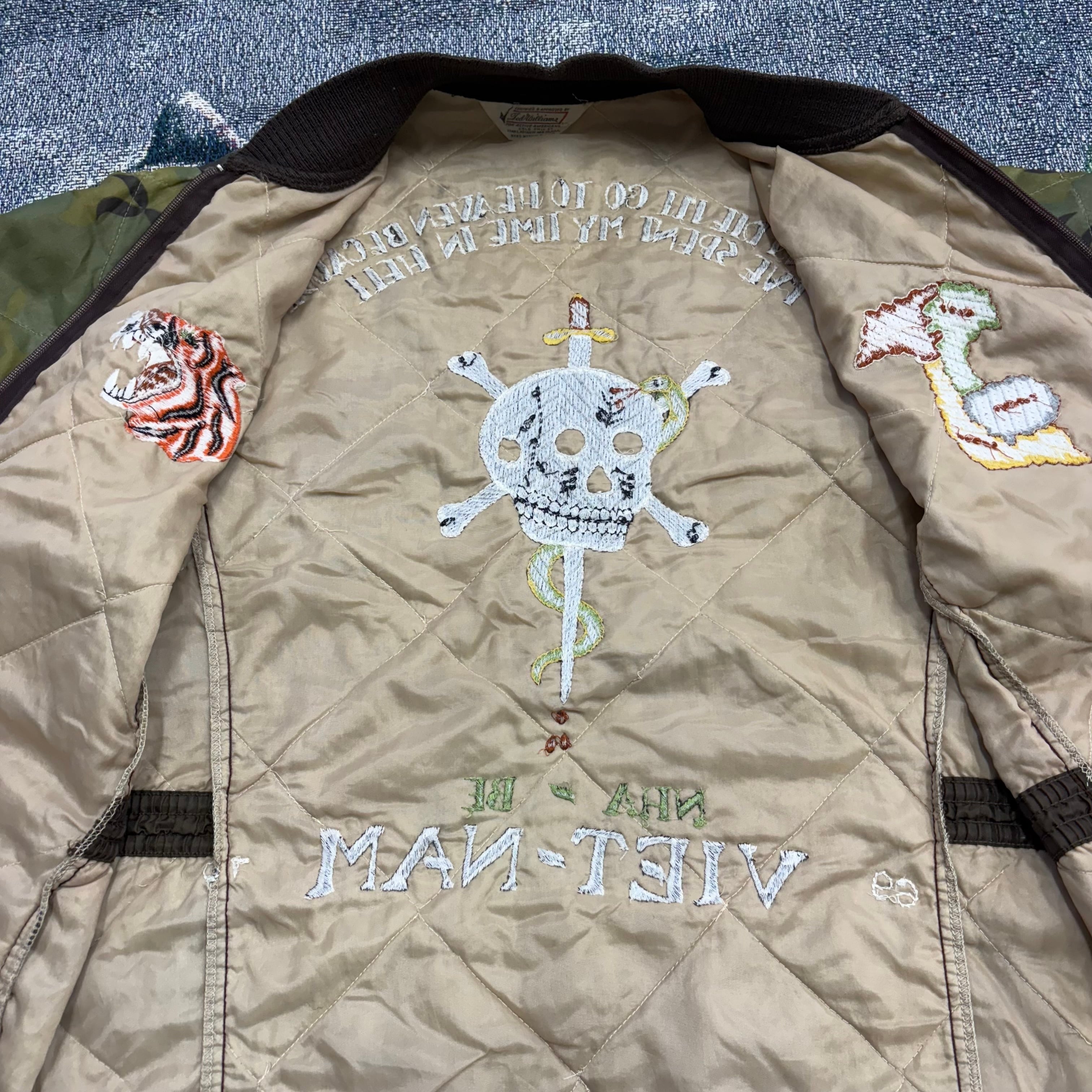 カモフラージュ柄のキルティングボディに、胸にはタイガーヘッドとベトナムの地図刺繍、背面にはスカル・ダガー・スネークのインパクトある刺繍が施された強烈なデザイン。