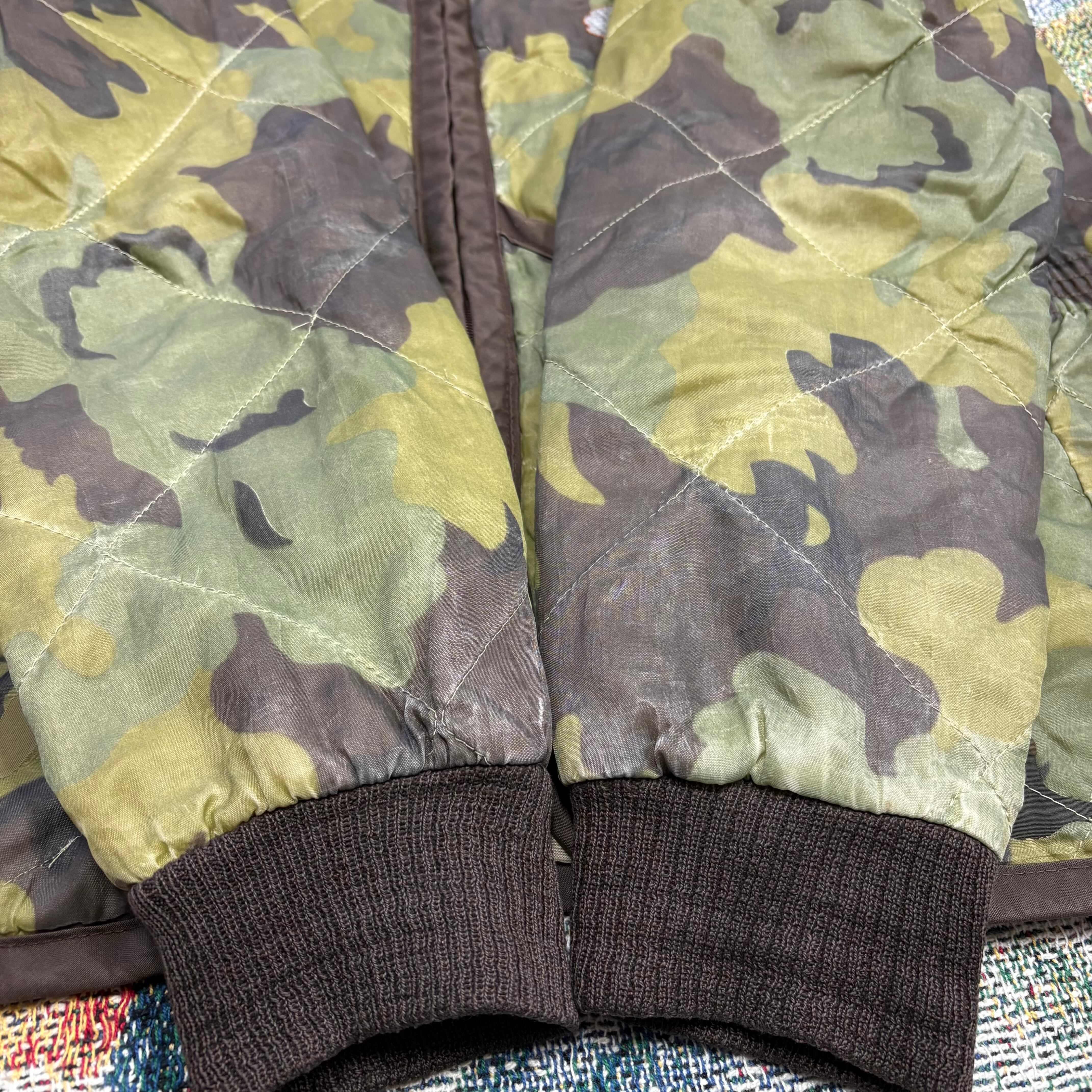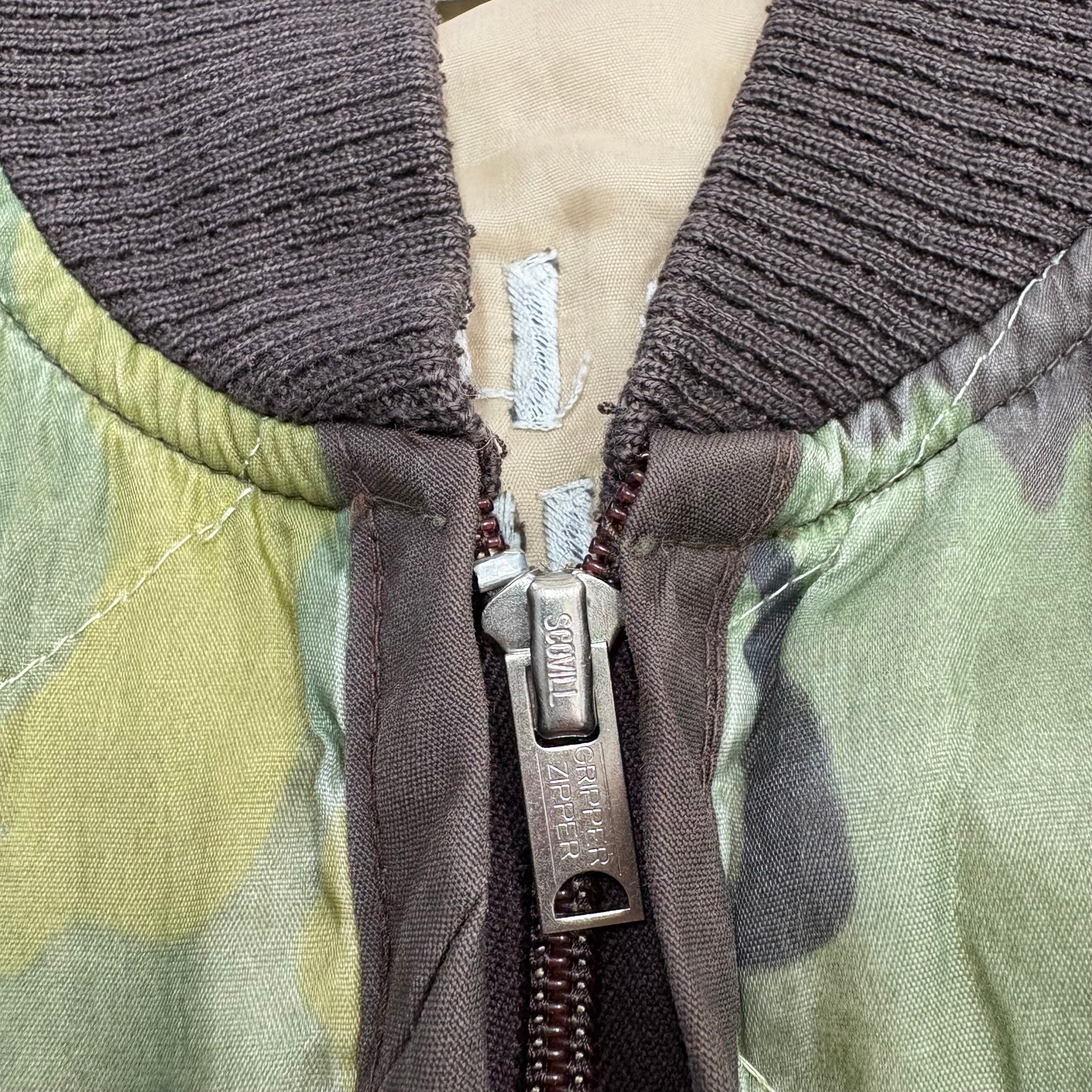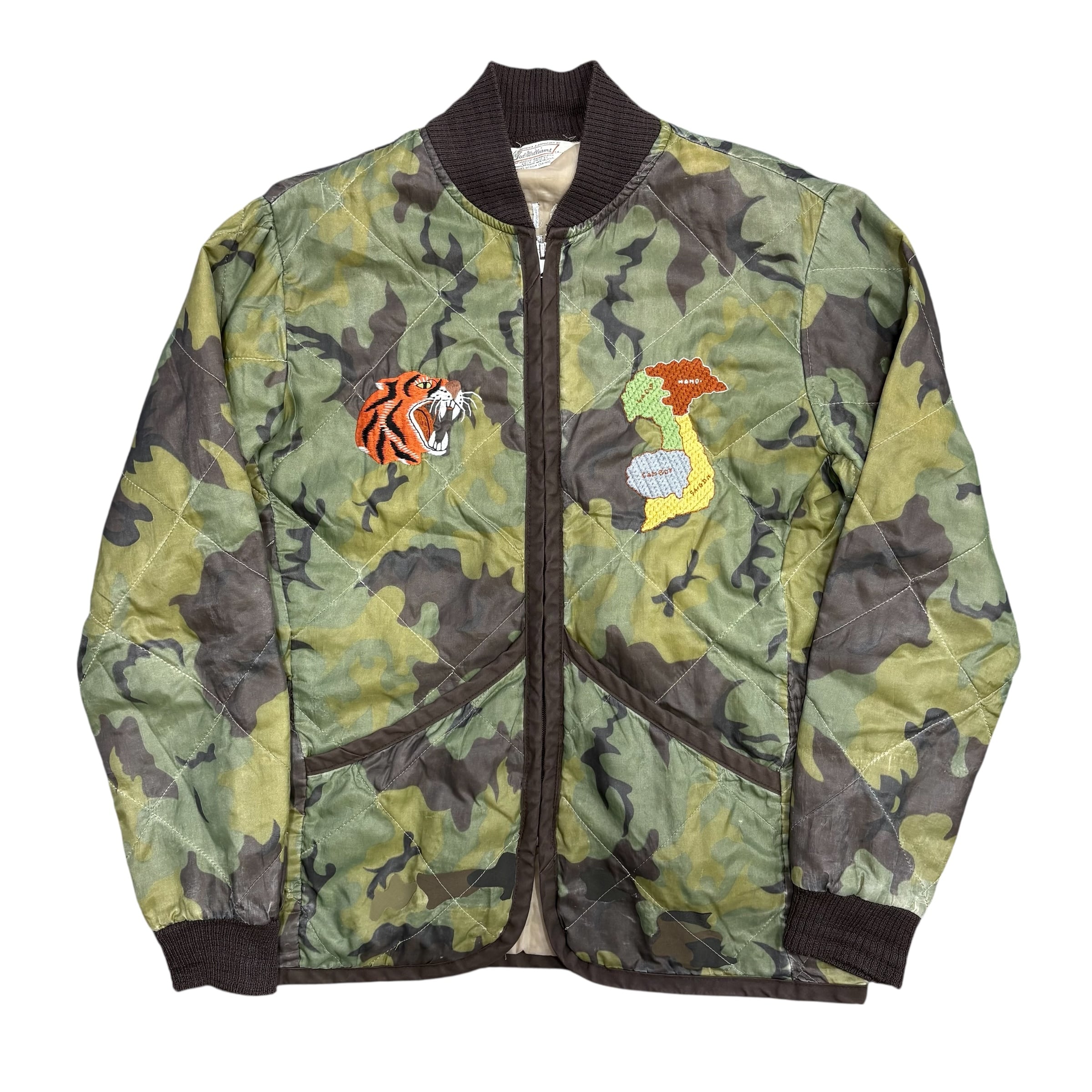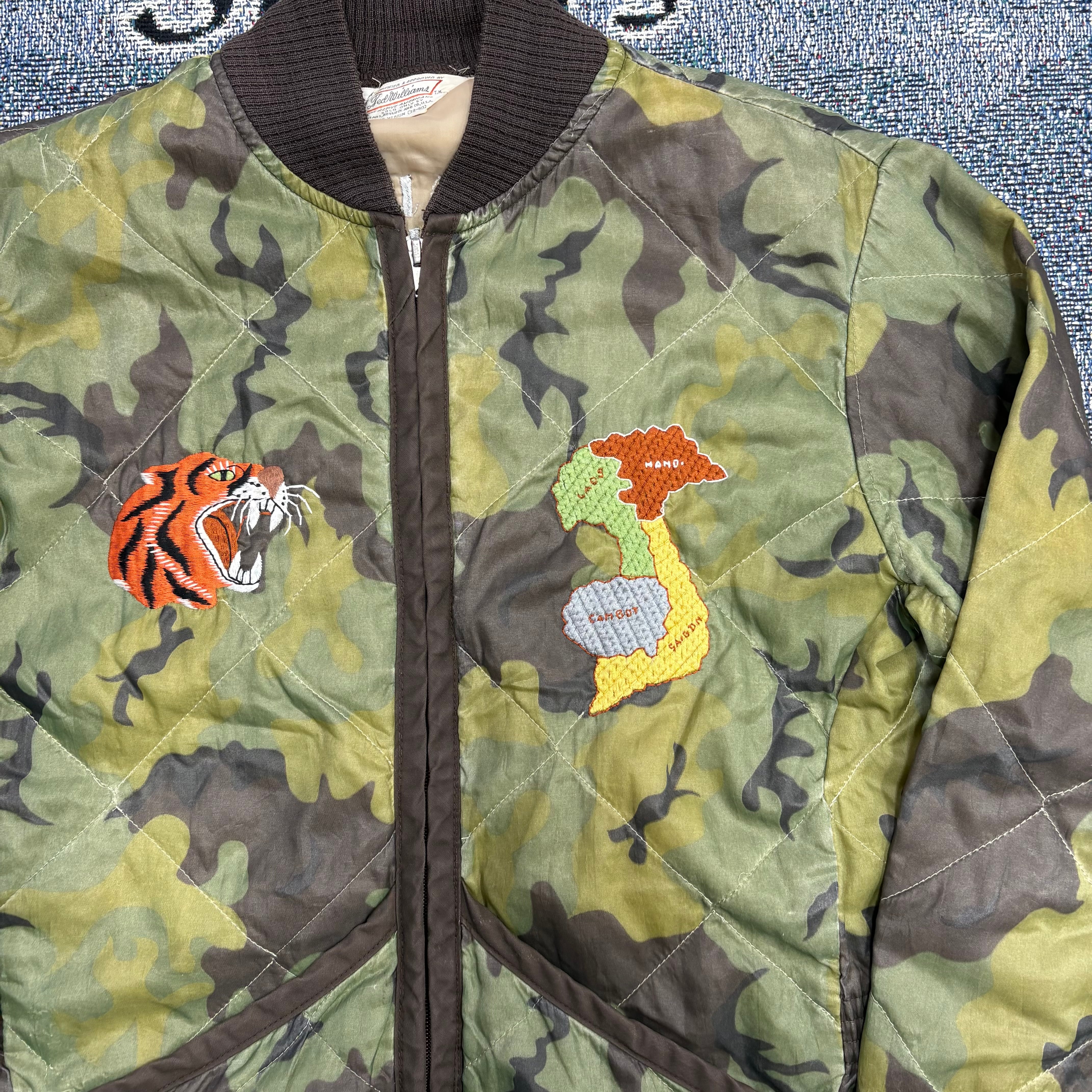 カモフラージュ柄のキルティングボディに、胸にはタイガーヘッドとベトナムの地図刺繍、背面にはスカル・ダガー・スネークのインパクトある刺繍が施された強烈なデザイン。