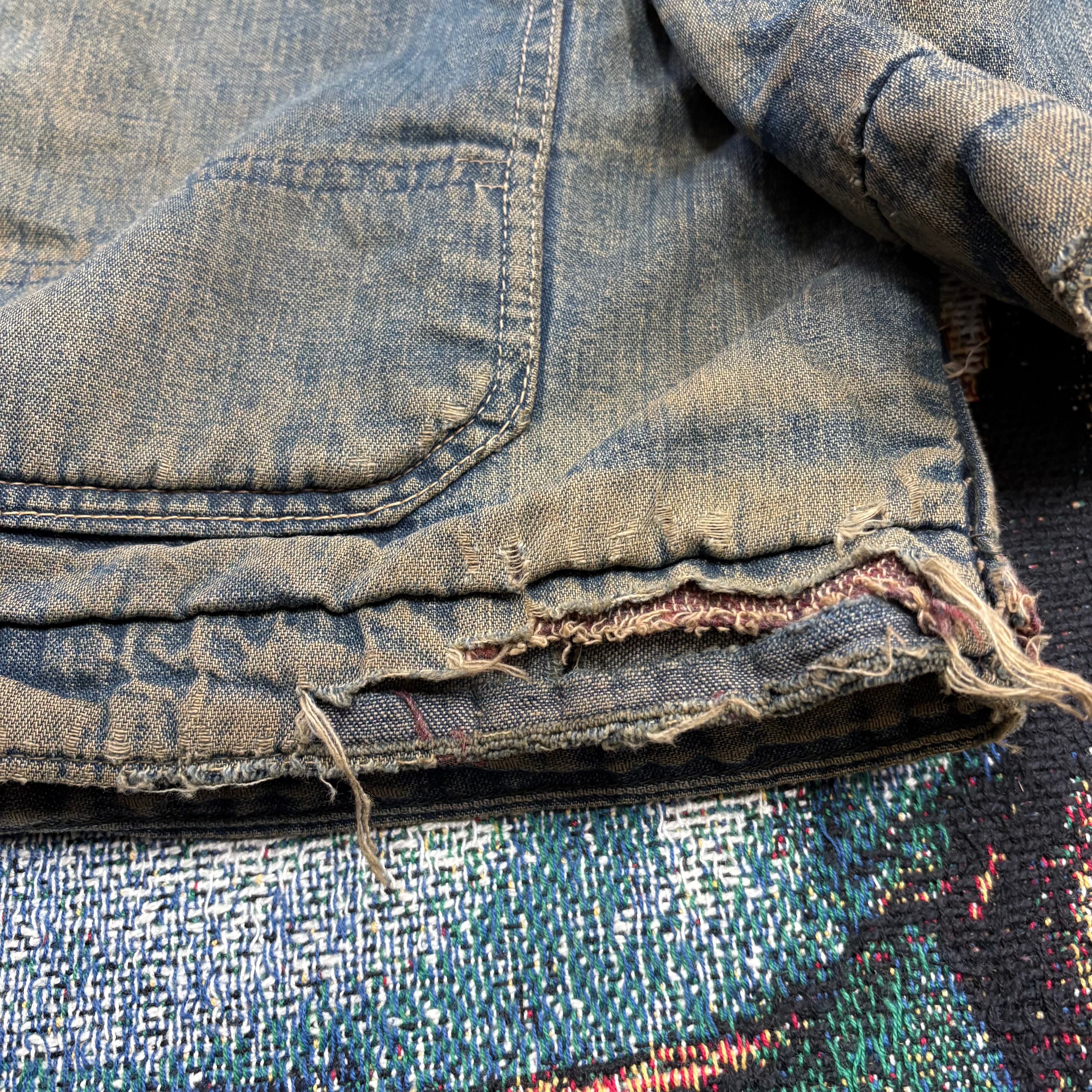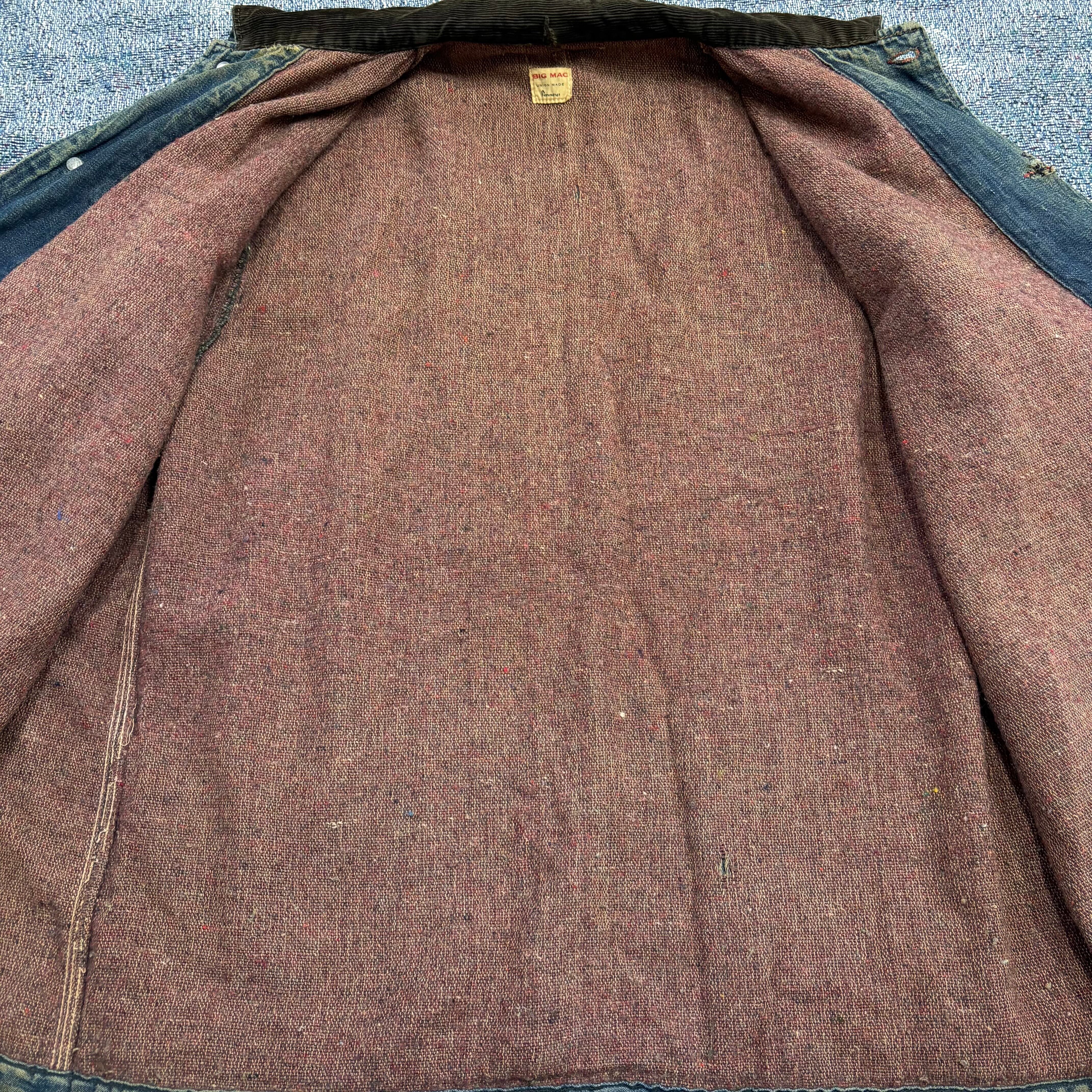 胸のフラップ付きポケット、腰の大きなパッチポケット、赤いカンヌキ、そしてユニオンチケット付きのBIG MACタグ。王道の4ポケットカバーオールながら、この個体は襟コーデュロイ×ブランケットライナー仕様